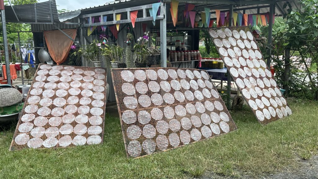 Traditional way of making Rice Paper – Rice paper is a thin edible sheet made primarily from rice flour, water, and tapioca starch. It is then dried in the sun. Just before being used, it is rehydrated in water to become soft and pliable before being wrapped around fillings. When fried, it becomes crispy.