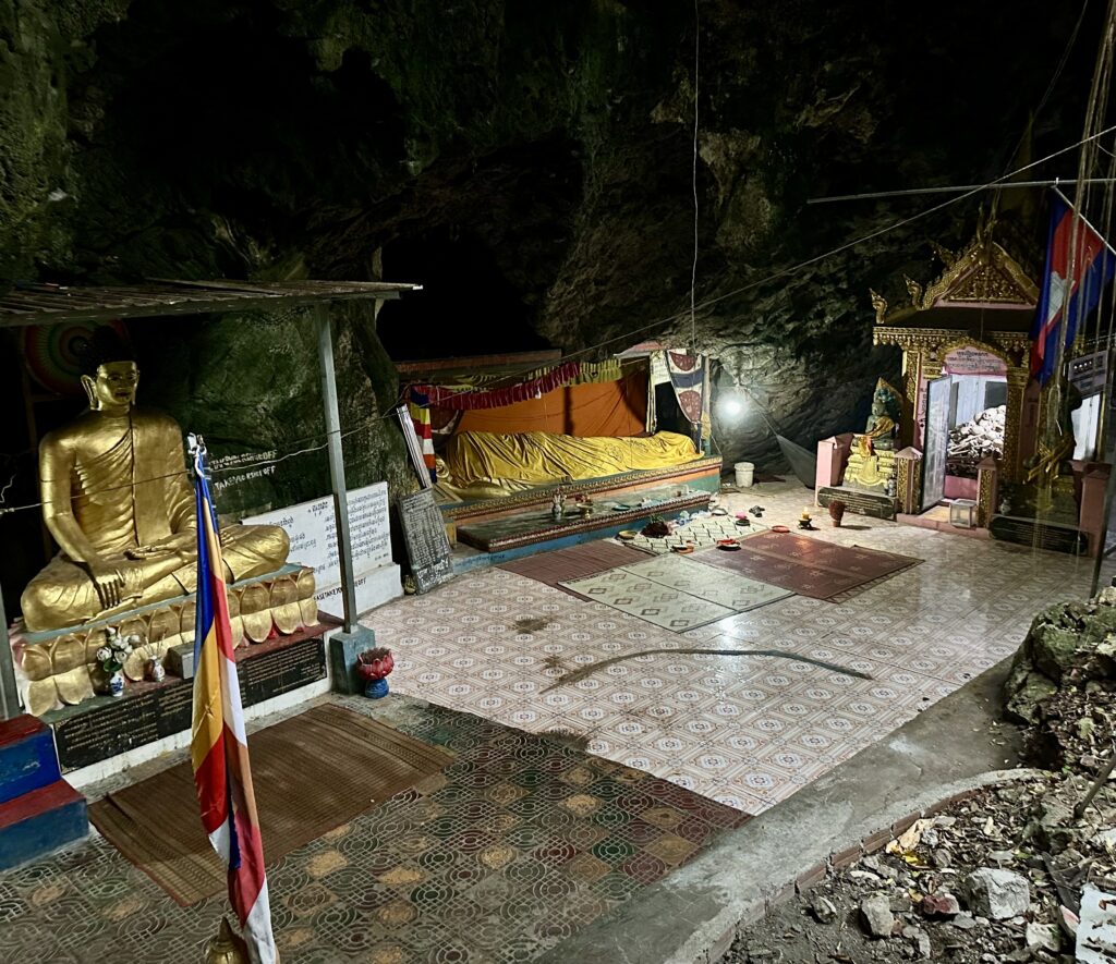 During the Khmer Rouge in the period 1975 to 1979, the mountain of Phnom Sampov and its caves were used to accumulate the war victims who were later executed. They killed their victims on top of the cave at the rim of a daylight shaft or ceiling hole and threw the corpses into the cave. The caves are now a reminder of the dark history and have multiple important religious temples. A large glass memorial in the cave with skulls and bones, and a golden reclining Buddha, mark the massacre.