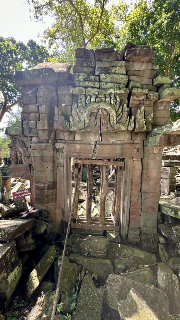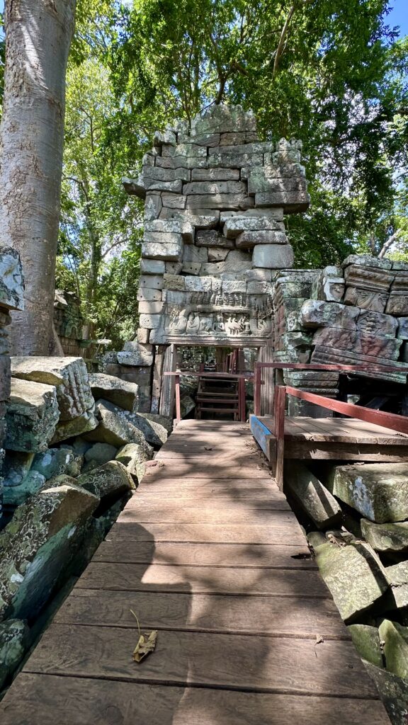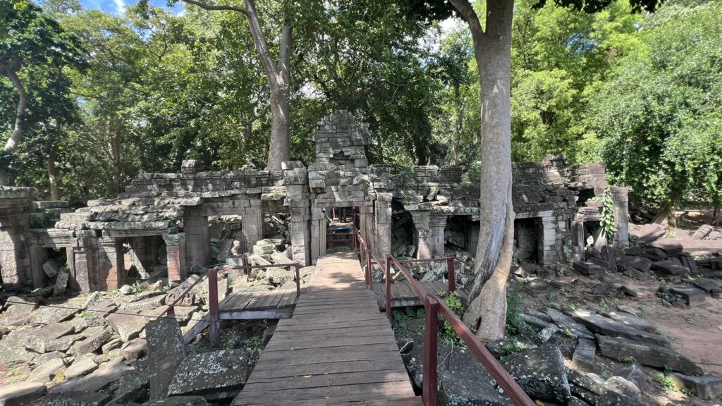 Banteay Chhmar is well-maintained with wooden walkways that allow visitors to walk over the rubble of the collapsed temple complex. These boardwalks are part of an effort to make the site accessible while protecting it, as the site is still undergoing significant restoration.