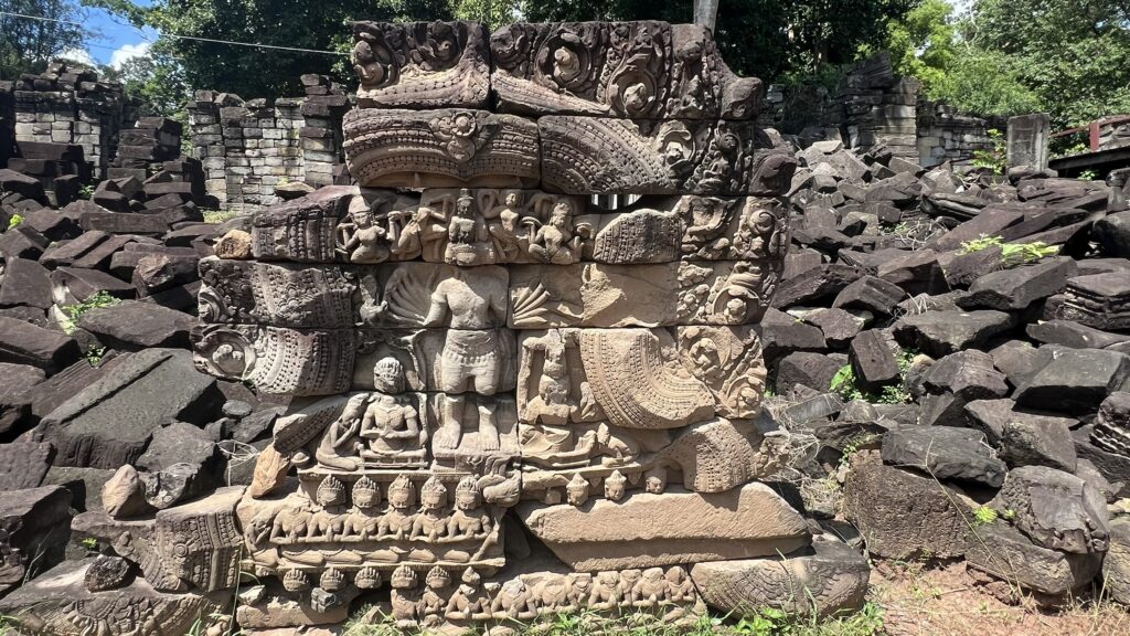 The centerpiece here is Wat Ek Phnom, a 11th-century Hindu temple built during the reign of King Suryavarman I. Though partly collapsed and weathered over time, the walls are adorned with intricate carvings depicting tales of Hindu mythology.