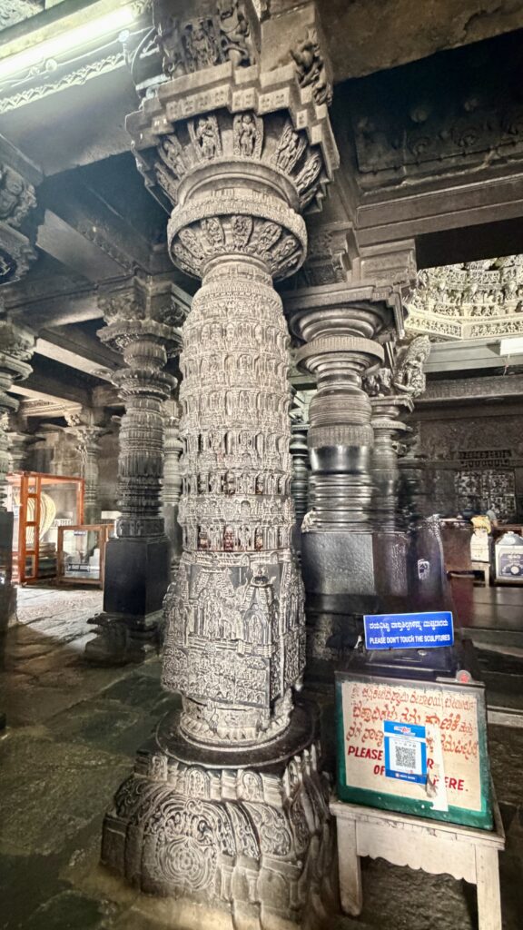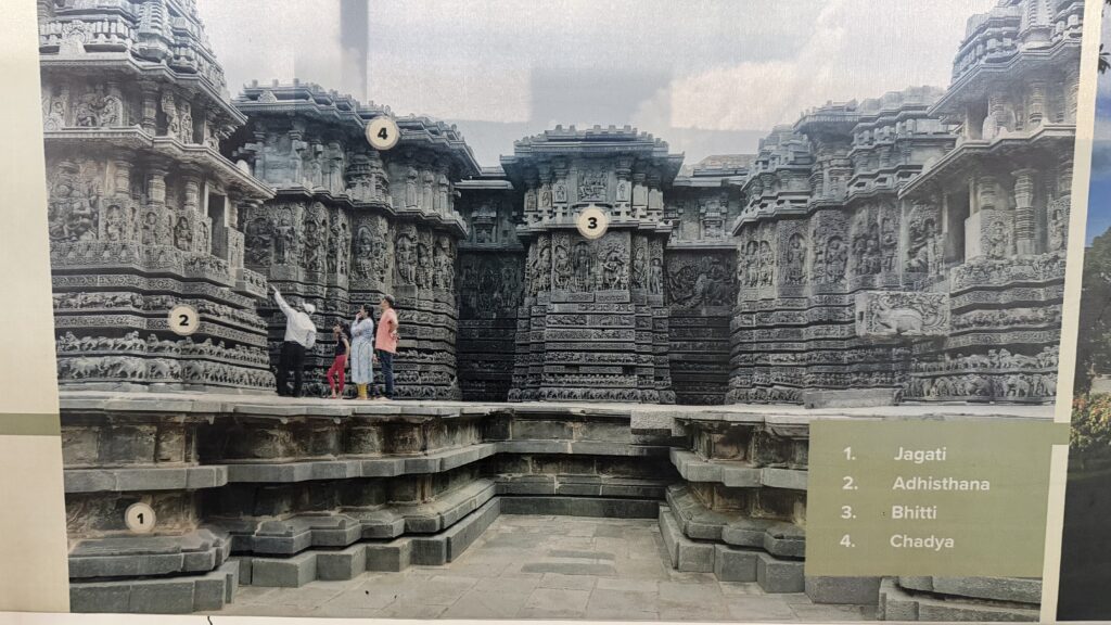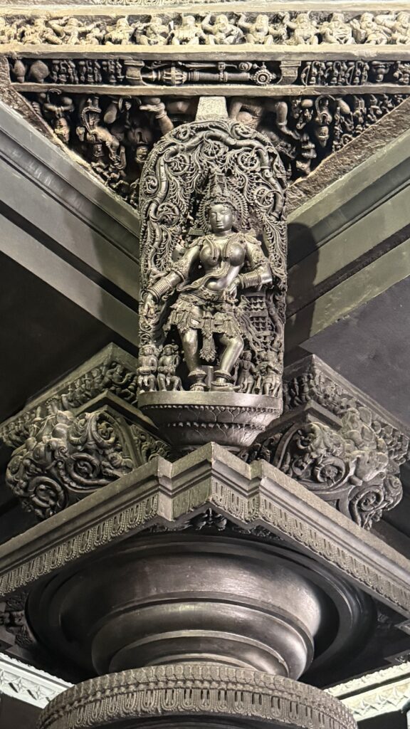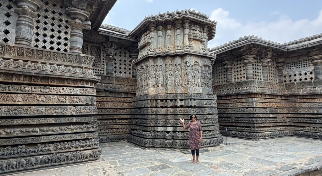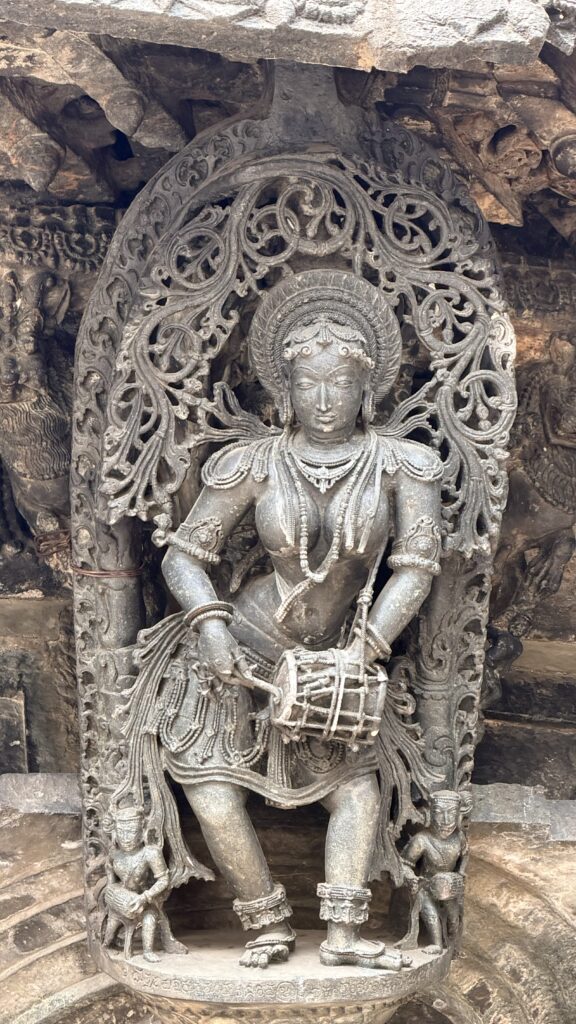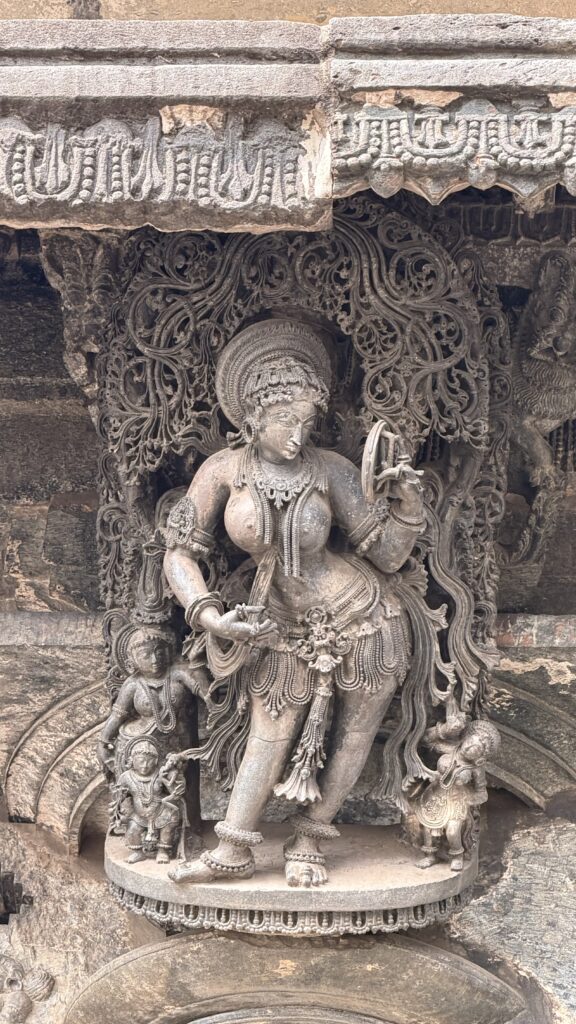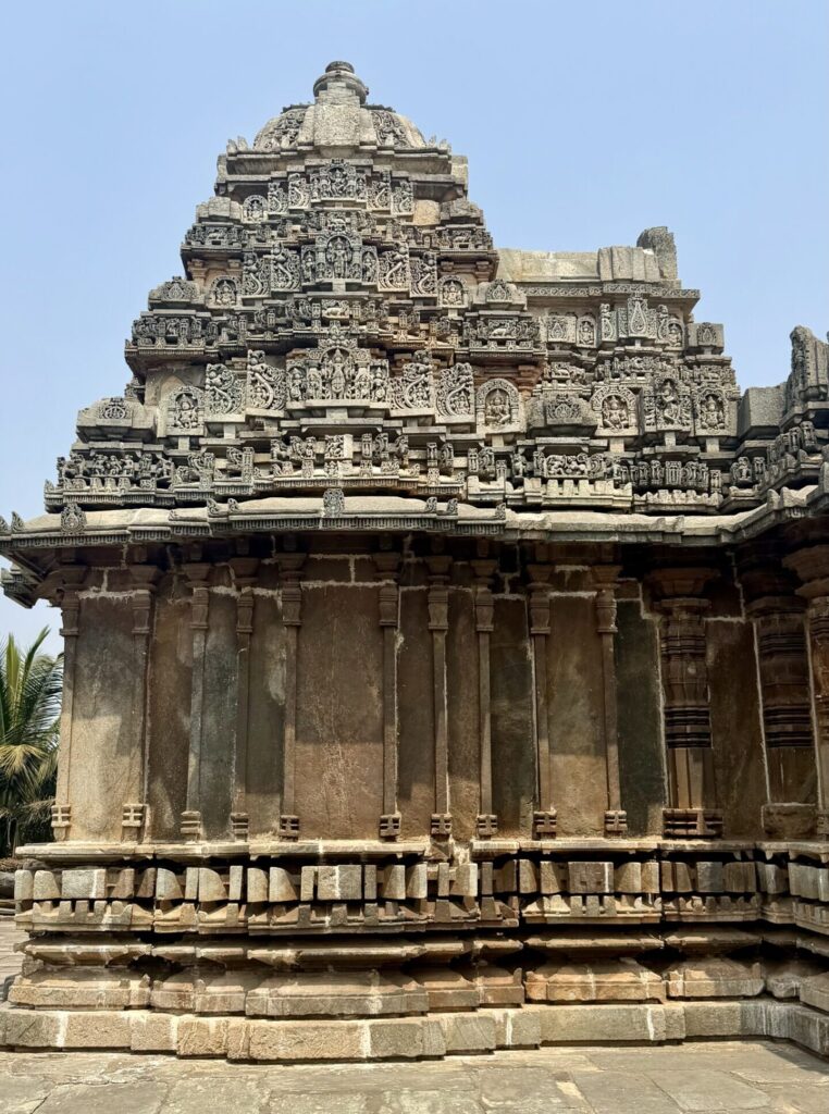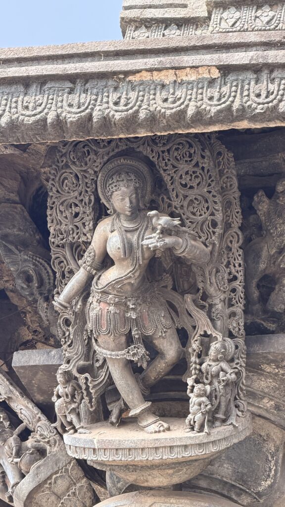 The lowest layers of the outer walls, consist of horizontal bands of friezes arranged from bottom to top—depicting elephants, lions, decorative scrolls with nature and miniature dancers, horses, scenes from Hindu epics, mythical creatures such as makaras, and swans. These carvings stretch for more than 200m. The middle sections of the outer walls, feature large sculptural panels portraying a vast pantheon of Hindu deities. The upper portion has beautifully perforated screen, a hallmark of Hoysala artwork.