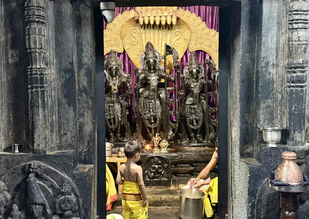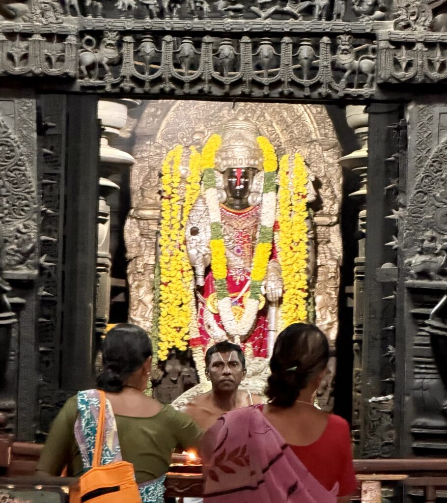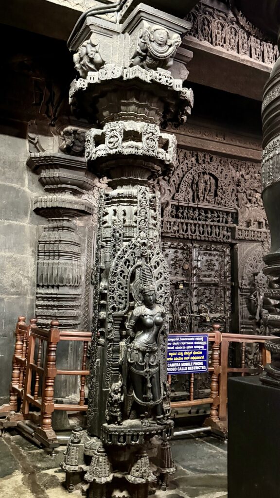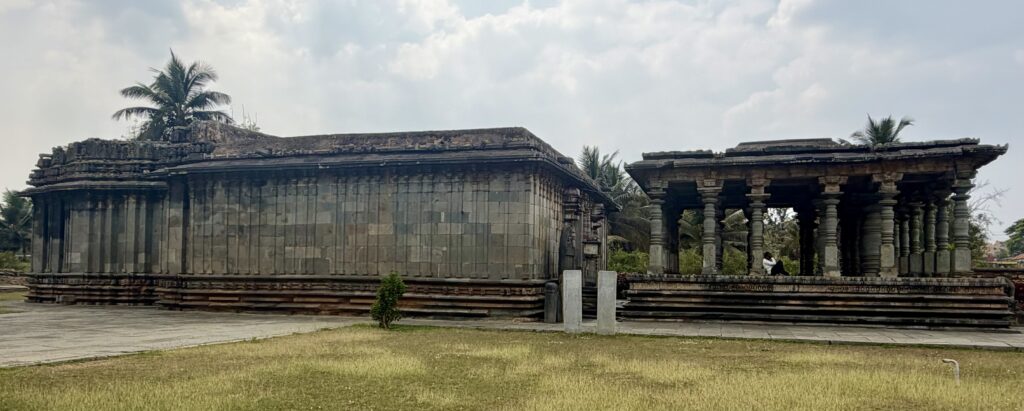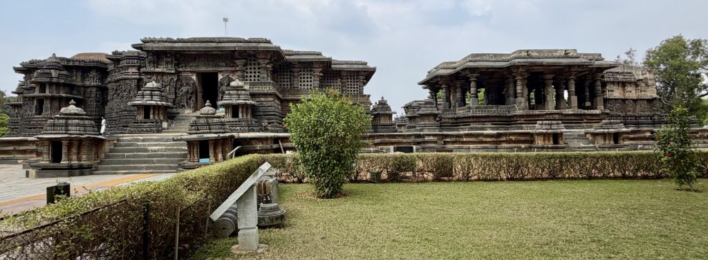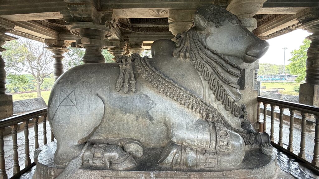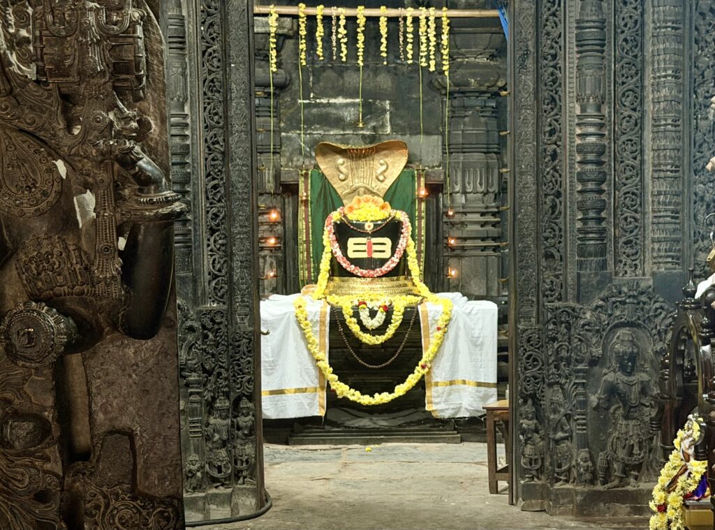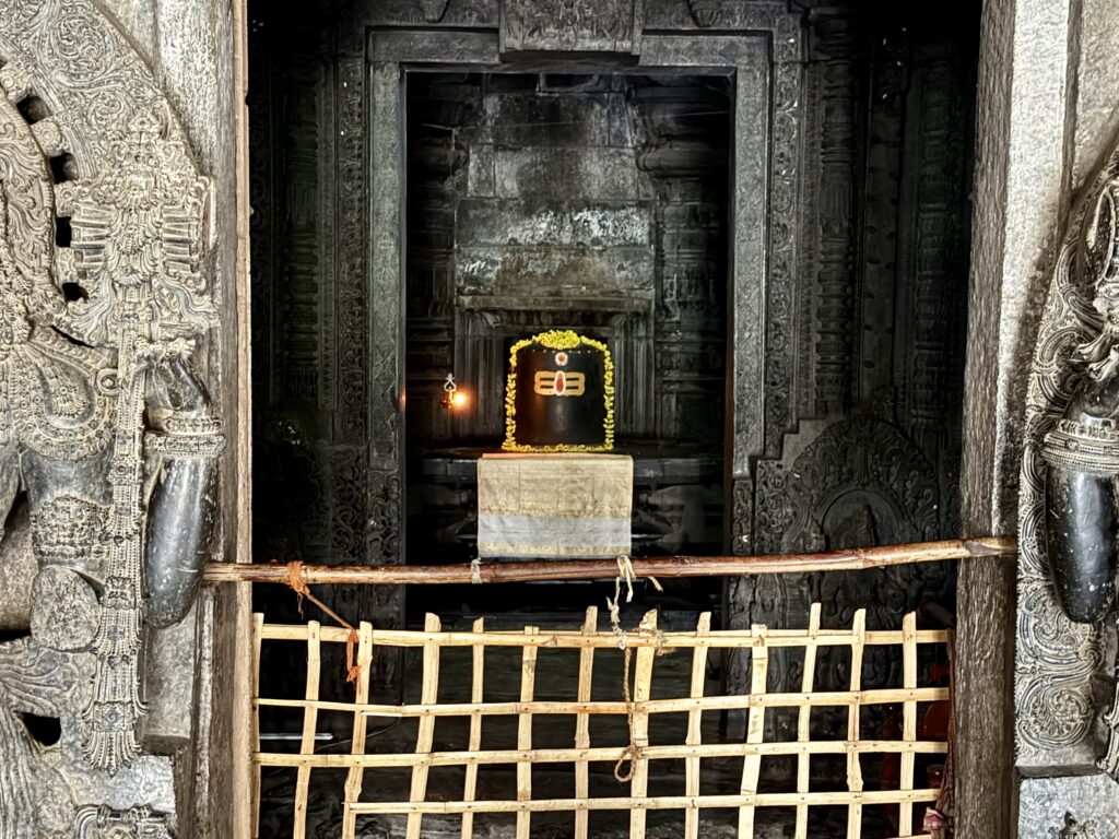The temple is a twin-shrine (dvikuta) structure, housing two Shiva lingas—Hoysaleswara and Santaleswara—representing the masculine and feminine aspects of Shiva. Hoysaleswara Linga is located in the southern sanctum, and is named after King Vishnuvardhana (who held the title Hoysaleswara). Santaleswara Linga is located in the northern sanctum, and is named in honor of Queen Shantala Devi, the wife of King Vishnuvardhana. Each shrine has its own Nandi pavilion, with the sacred bull facing the sanctum. Though primarily a Shaiva monument, the temple’s sculptures also include themes from Vaishnavism, Shaktism, and Jainism, reflecting the religious harmony of the time.