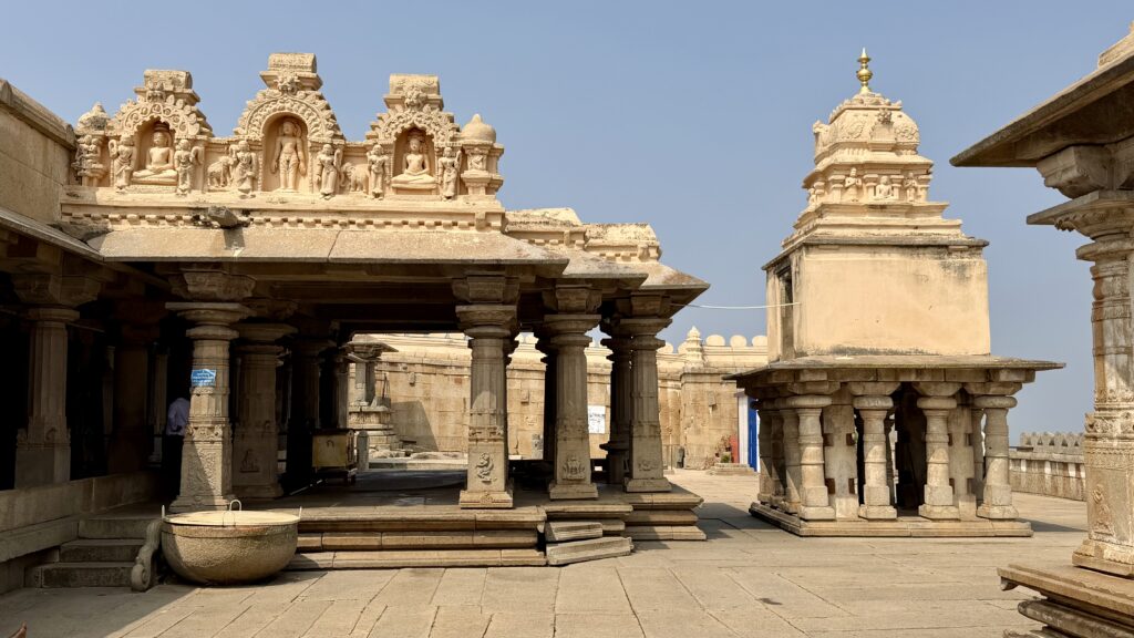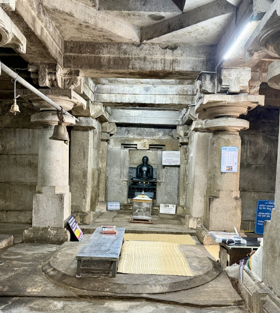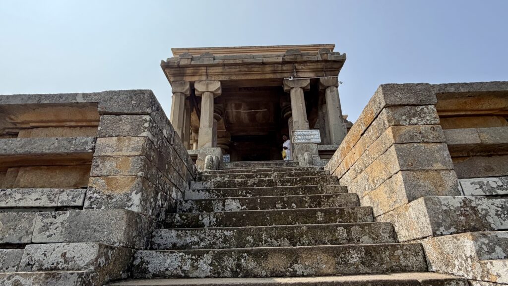 Odegal Basadi or Vadegal basadi – You will come across this Jain temple a little more than halfway up the Vindhyagiri hill. Built in the 14th century, this granite temple derives its name from Odega, referring to the soapstone slabs used to strengthen its walls. The temple is also known as a Trikuta Basadi because it has three sanctums facing different directions. Its exterior is relatively simple and non-ornate, but the structure is impressive in scale. Inside, the temple houses images of the Jain Tirthankaras Rishabhanatha, Neminatha, and Shantinatha, carved from dark-colored schist.