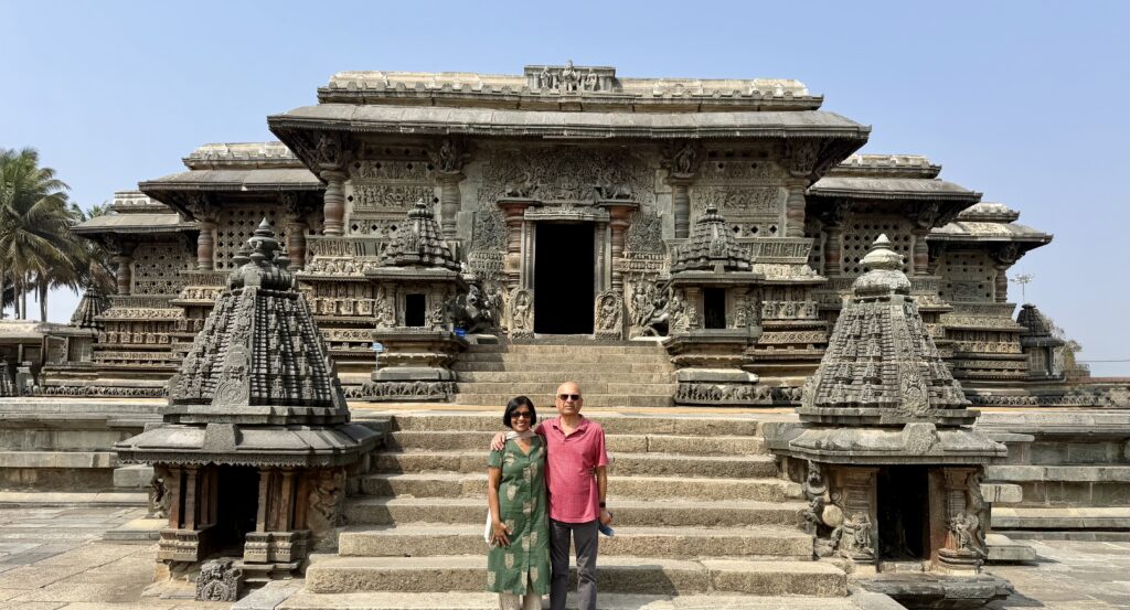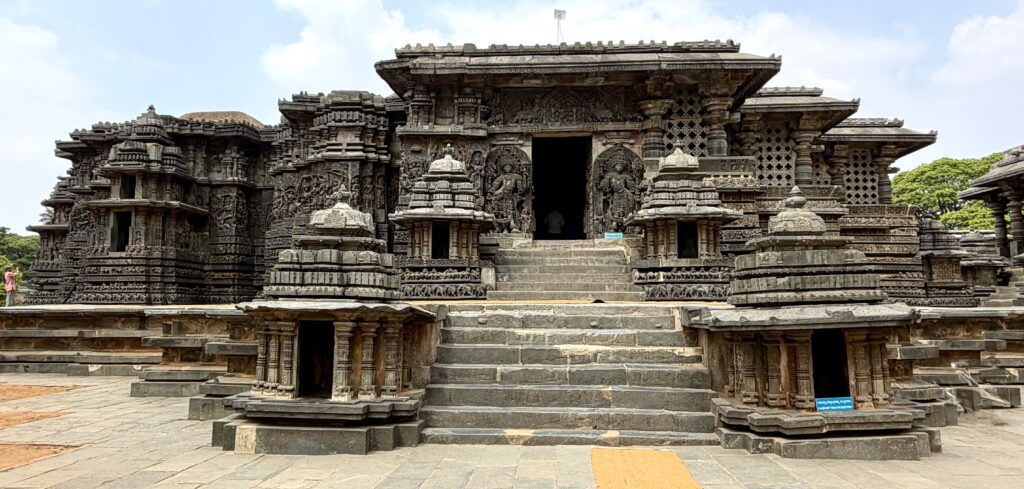 Halebidu, Hoysaleswara Temple (UNESCO World Heritage Site) – is a magnificent 12th-century Hindu temple dedicated to Lord Shiva. Commissioned by King Vishnuvardhana, construction began around 1121 CE and was completed by 1160 CE. Built on the banks of a large man-made lake and carved primarily from soapstone, the temple is the largest monument in Halebidu.