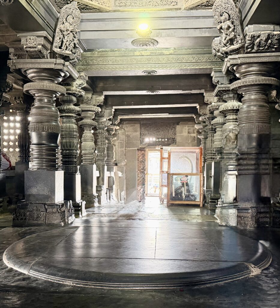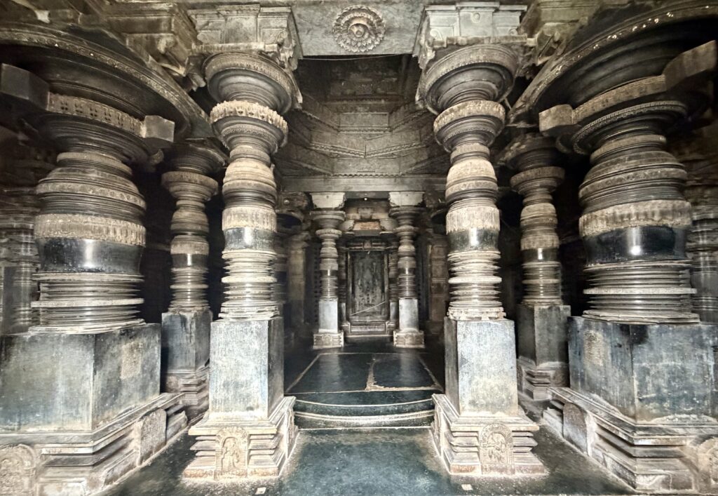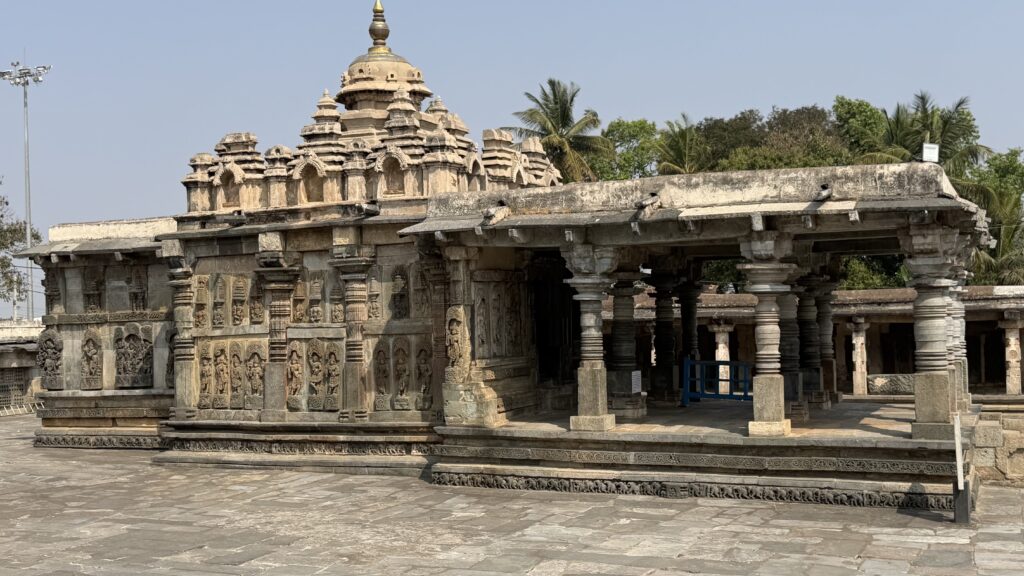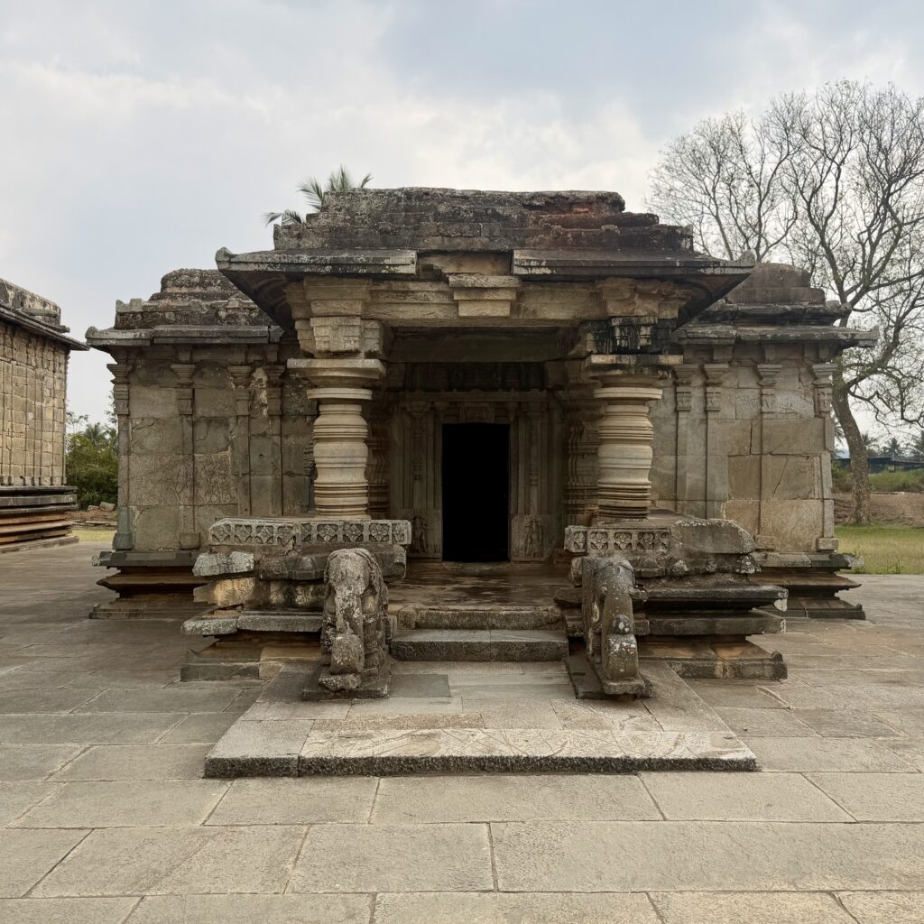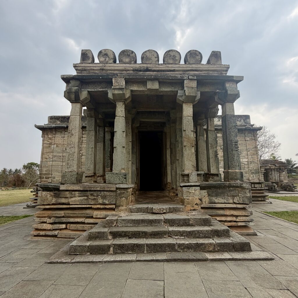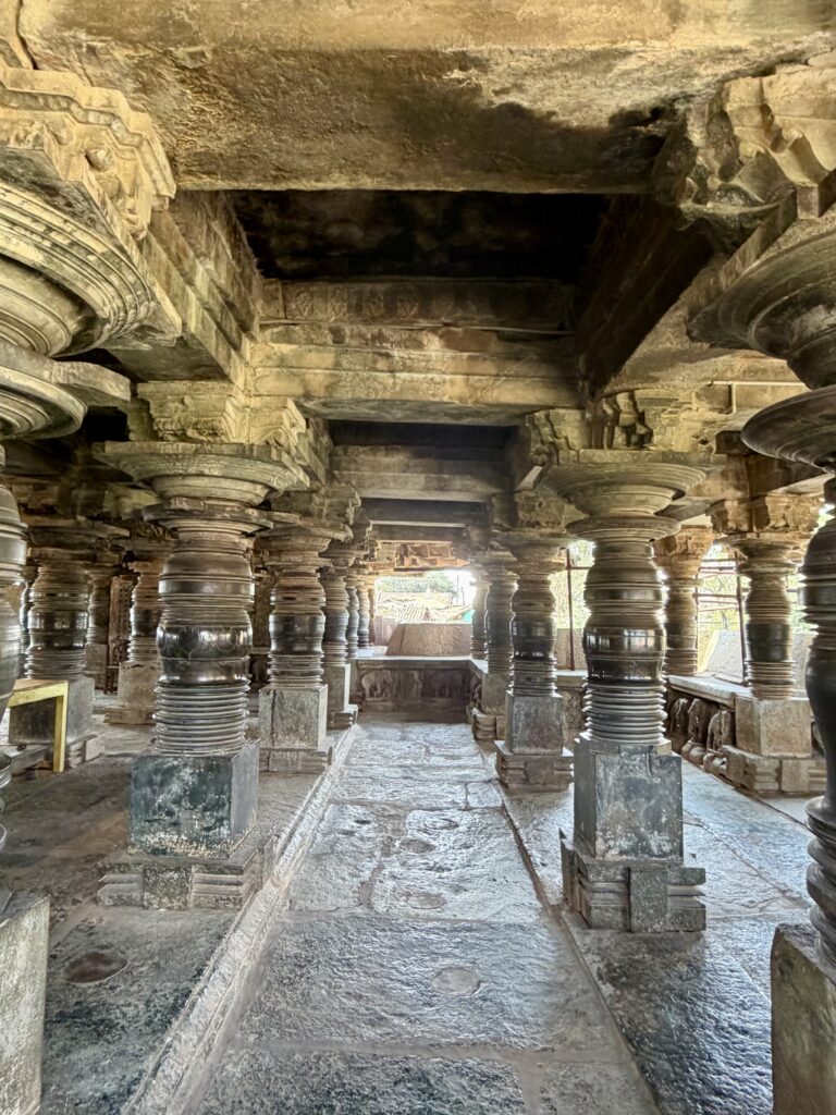 The main shrine follows a distinctive star-shaped plan, a hallmark of Hoysala architecture, with multiple projections and recesses that create space for decorative carvings. The interior hall of the temple features beautifully crafted lathe-turned pillars and domical ceilings.