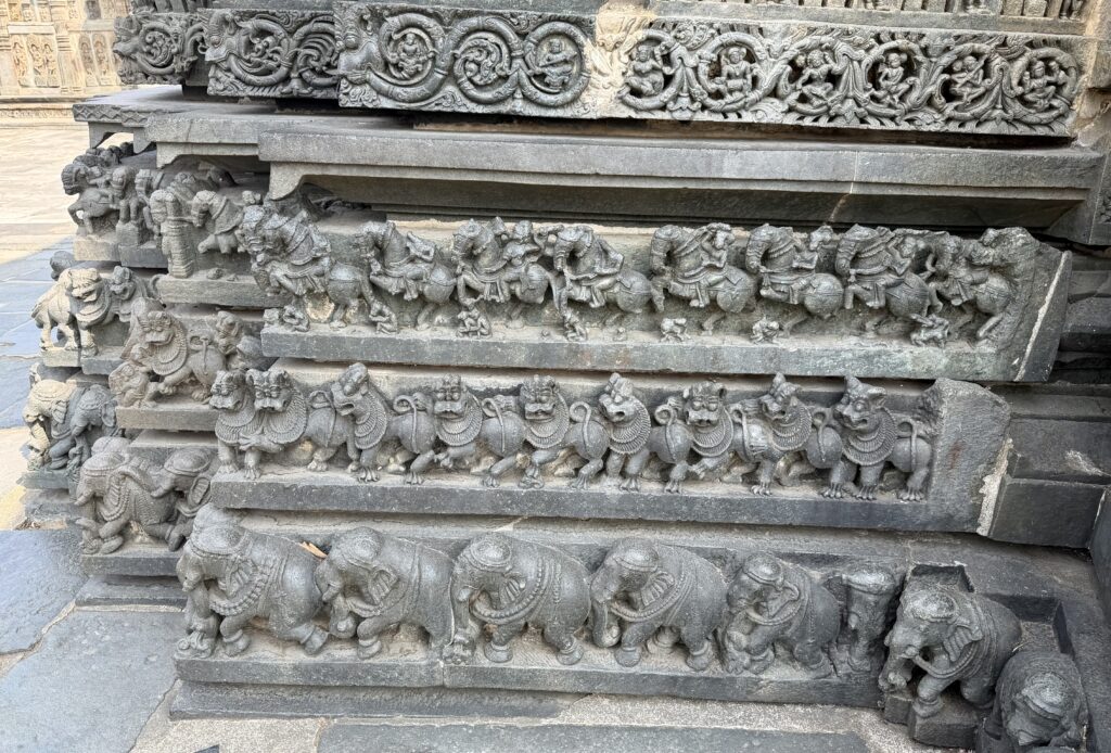 Similar to the carvings seen at the Hoysaleswara Temple, the exterior walls of the Chennakesava Temple are completely covered with intricate sculptures. The lowest horizontal bands feature a row of elephants, each uniquely carved and symbolizing strength. Above them is a row of lions, representing courage and power, followed by a band of horses, symbolizing speed and energy.