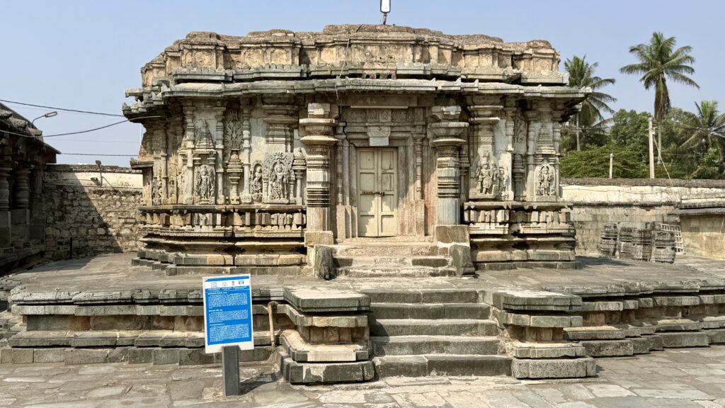Constructed from soapstone, a material widely used in Hoysala architecture, the temple stands on an elevated platform called a jagati, about 5–6 feet high, which allows devotees to circumambulate the shrine and also provides an excellent view of the intricate sculptures along the outer walls. The temple walls are adorned with detailed sculptural panels depicting various Hindu deities and mythological scenes.