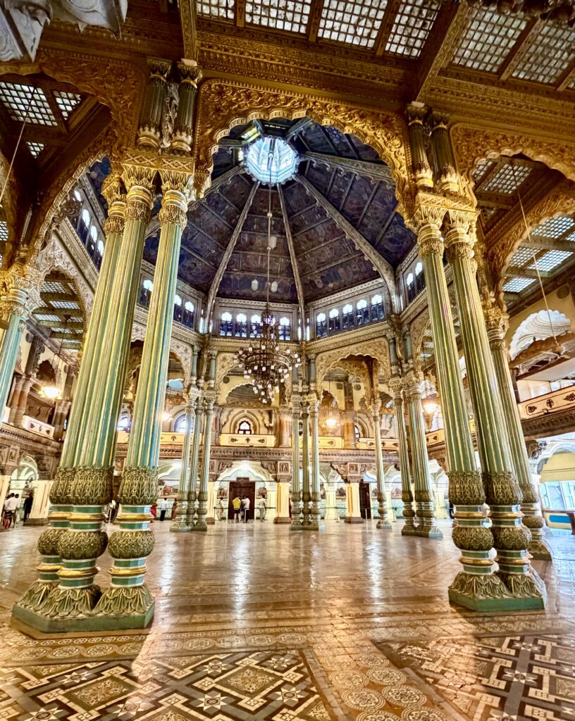 - The Kalyana Mantapa (Marriage Pavilion) – is octagonal dome-shaped opulent hall featuring a multi-hued glass ceiling, imported from Belgium. The floor is decorated with, intricate peacock mosaics using glazed tiles. The dome is supported by, ornate, cast-iron pillars. The walls feature massive oil paintings that showcase the traditional, Dasara procession in Mysore.