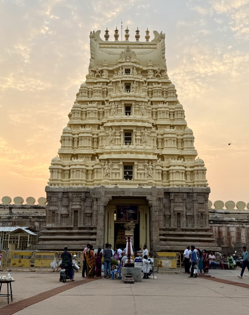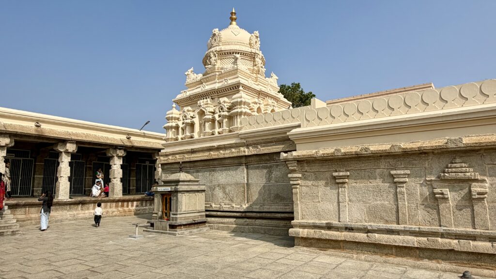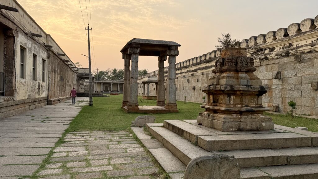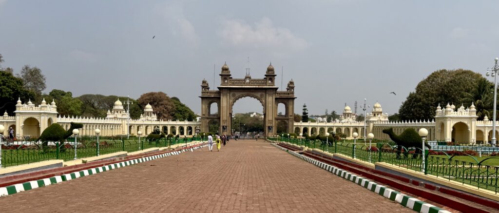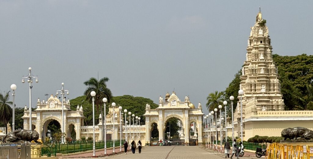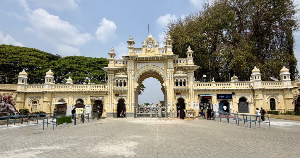 After exploring the interior of Mysore Palace, we walked around the palace grounds, passing through the residential wing. The path eventually led us to the Lakshmiramana Swamy Temple with its tall gopuram, after which we came across another gate within the palace complex.