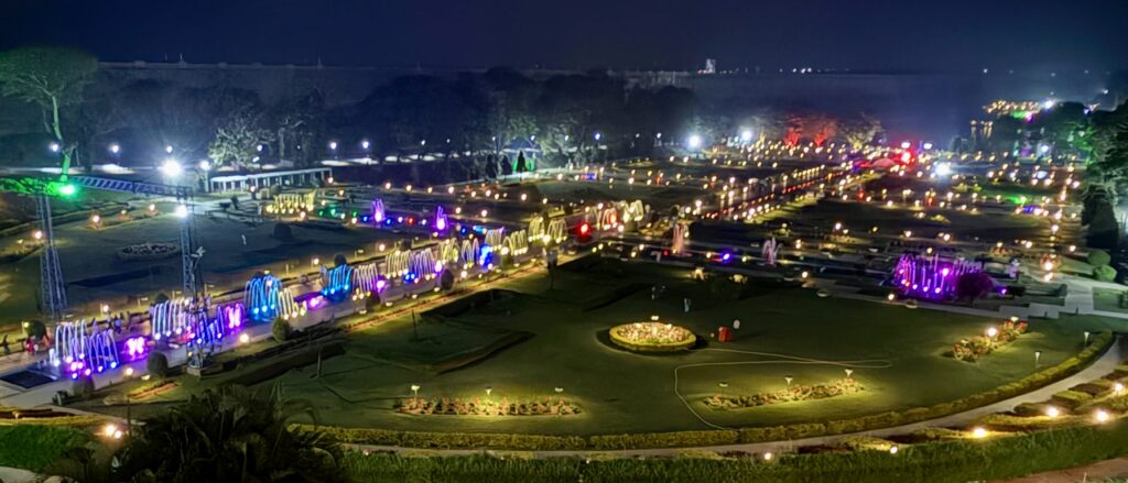 Brindavan Gardens, Night View and Musical Fountain – In the evening, the fountains were brilliantly lit in vibrant colors, creating a stunning sight. From the balcony of our room at Royal Orchid Brindavan Garden, we had a wonderful view of the entire Brindavan Gardens.