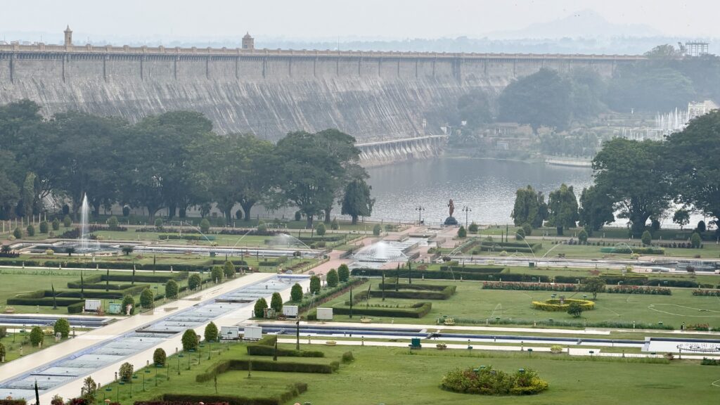 Brindavan Gardens, Krishnarajasagara Dam – The gardens lies adjoining the Krishnarajasagara Dam (or KRS Dam) which is built across the river Kaveri. The work on laying out this garden was started in the year 1927 and completed in 1932.
