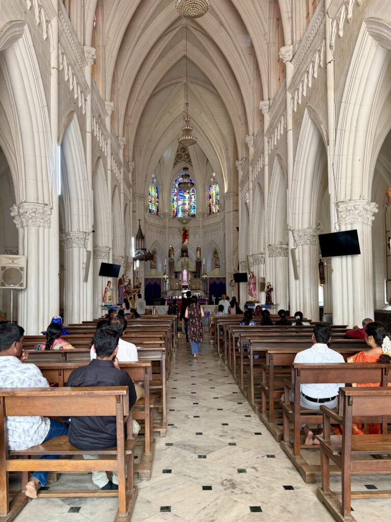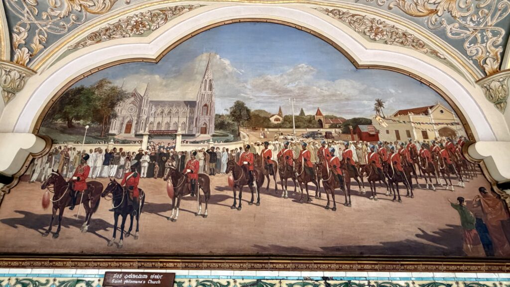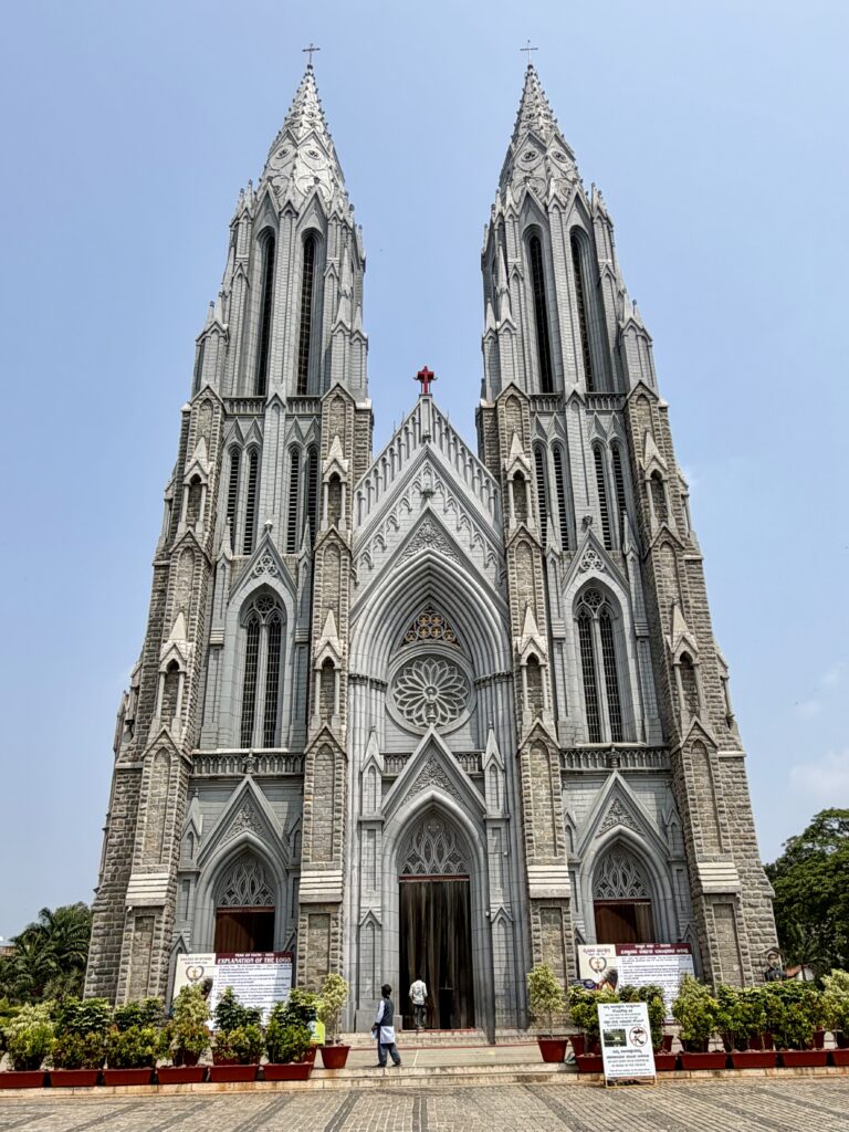 St. Philomena’s Cathedral – We decided to visit St. Philomena’s Cathedral after seeing its mural inside Mysore Palace (see painting in the above section). This magnificent church is well worth spending about 20 minutes exploring. It is a prominent Catholic church and serves as the seat of the Roman Catholic Diocese of Mysore. Built in 1936 during the reign of Krishnaraja Wadiyar IV, the cathedral showcases a striking Neo-Gothic design inspired by the famous Cologne Cathedral in Germany, and is considered one of the tallest churches in Asia. The cathedral is dedicated to Saint Philomena, a young Greek princess believed to have been martyred in the 4th century.