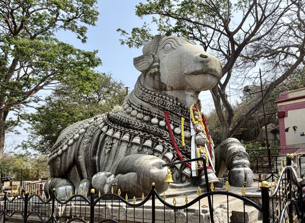 Nandi Statue – at Chamundi Hills is a magnificent monolithic sculpture that is more than 350 years old and one of the oldest icons in Mysuru. In Hindu mythology, Nandi is the sacred bull and vehicle of Shiva, typically placed facing Shiva temples. Standing about 16 feet high and 24 feet long, this statue is the third largest Nandi in India and was commissioned by Dodda Devaraja Wodeyar in the 17th century. The sculpture was carved directly out of a massive boulder and features beautifully detailed carvings of bells and garlands.