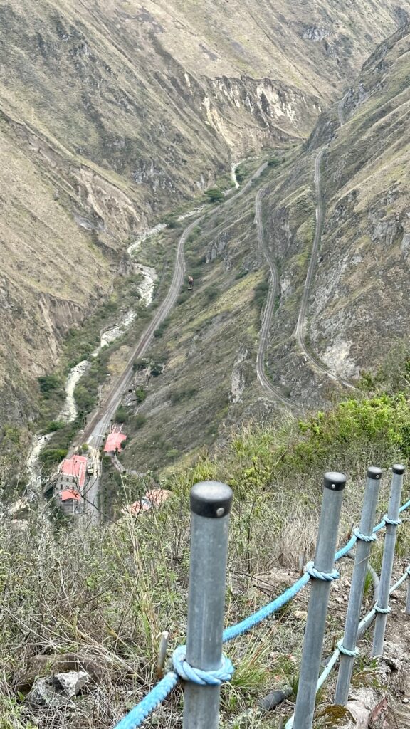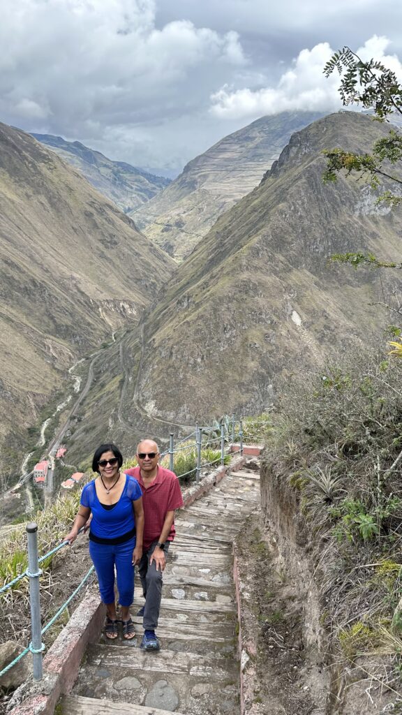 Devil’s nose mountain – We stopped at here to see the railway tracks which is one of South America’s most iconic stretches of rail. The Devil’s Nose train descends the Andean mountainside via an impressive set of switchbacks. As mentioned in my previous page in this blog, the train is not operating currently as Ecuadorian government closed down the country’s railways in 2020 to reduce expenditure. The train station you see at the bottom of the mountain is the Sibambe train station. Alausi to Sibambe train journey was 45 min. There are steps that go all the way to the bottom. Since we were pressed for time, we climbed down maybe one fourth of the way, admired the view and took a few snaps and were back on top. It was clear that the task of building the railroad was an arduous task and the sights that one would get riding the train would have been impressive.