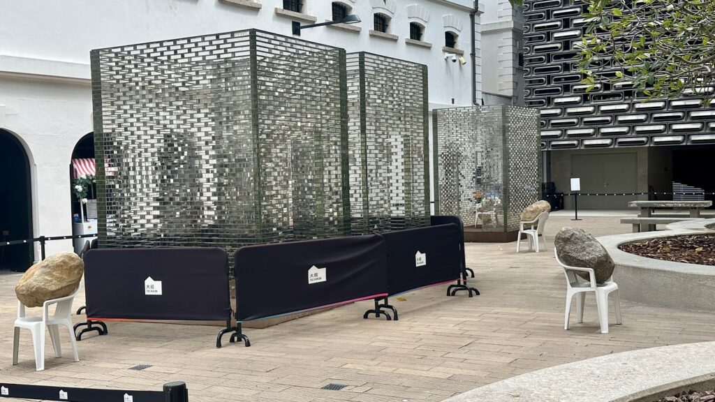 Tai Kwun, Prison yard – The yard has 6 glass structures near a group of white chairs, each holding a large stone. Prisoners would experience punishments, inspections, assemblies, and exercises here. The size of the glass structures take after the prison cells in the nearby B and D Halls. They hint at invisible barriers in our daily lives, and the stones on the chairs may mean the burdens we handle.
