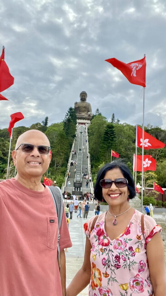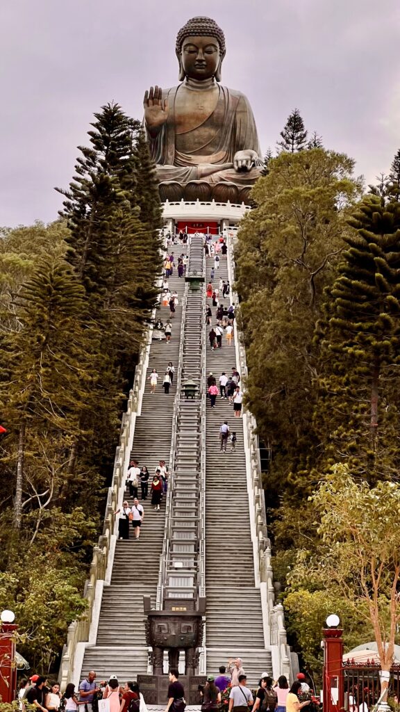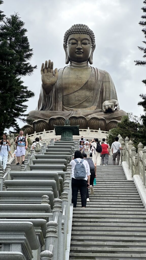 Our hotel had a free shuttle running every half hour to Tung Chung MTR station, from where we were going to take the Ngong Ping cable car. On the day we visited, the cable car was not operating due to bad weather warning. We had to take the #23 bus. The line to take the bus was pretty long but moved fairly fast. This particular bus takes cash or Octopus card (no Credit card). After about 50 minutes in the bus, we reached the small village of Ngong Ping. From the bus stop, it was a 3 minute walk to the base of the Tian Tan Buddha. We then had to climb 268 steps to reach one of the world’s largest sitting statues on the planet.