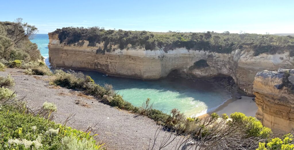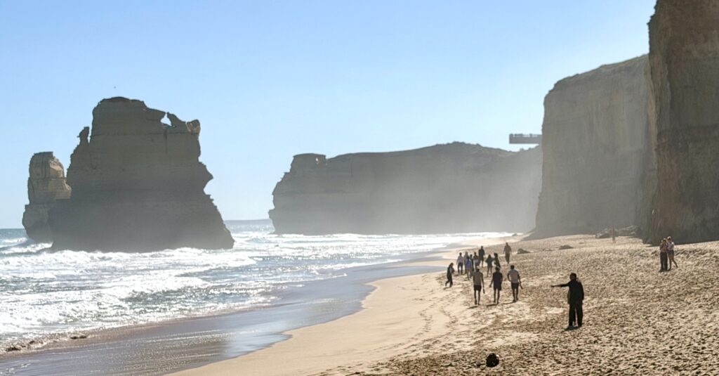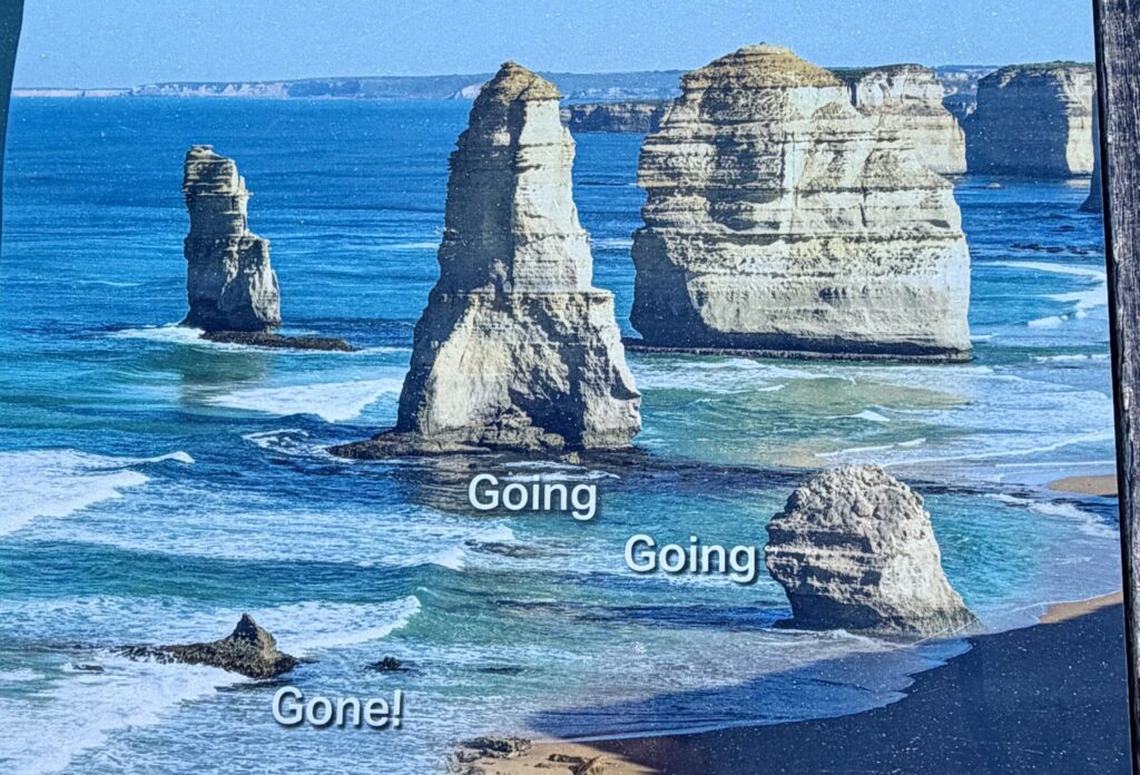 Note about the rock formations along Great Ocean Road – Along the road, powerful ocean waves both create and destroy rock formations. Cliffs are gradually eroded into caves, arches, and bridges, which eventually collapse to form rock stacks like the Twelve Apostles. Over time, these stacks continue to erode and collapse back into the ocean, showing the constant cycle of formation and destruction.
