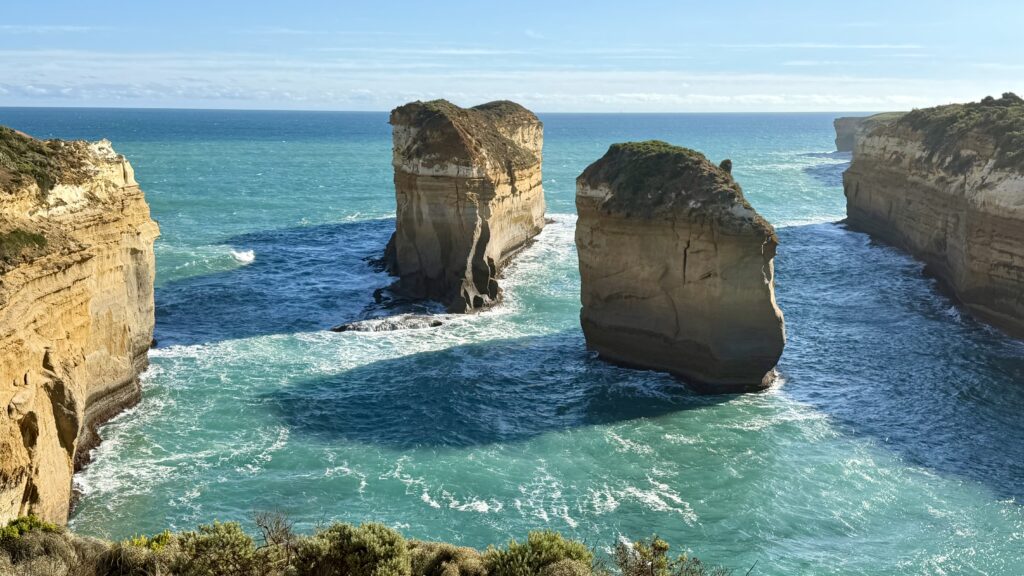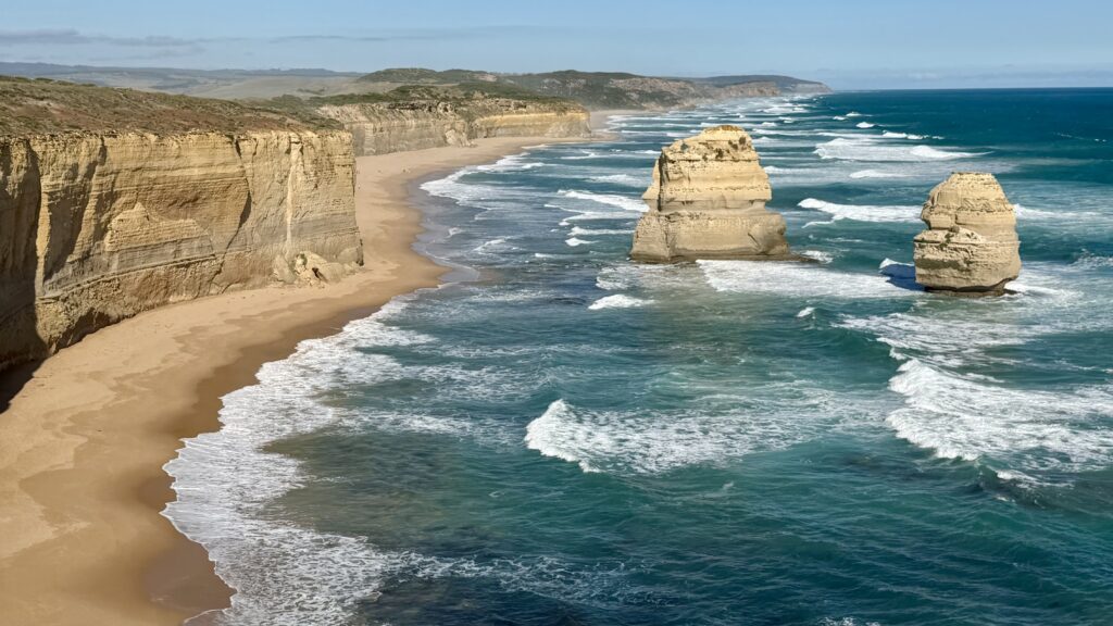 Port Campbell National Park, The Twelve Apostles – are a group of limestone stacks along the Great Ocean Road. Despite the name, there were never twelve stacks—only nine originally, with seven still standing today, though fewer are visible from the main viewpoint. Formed over millions of years from Port Campbell Limestone, they were shaped by erosion from the Southern Ocean, where cliffs turned into caves, arches, and eventually isolated rock stacks (which will also eventually collapse back into the ocean).