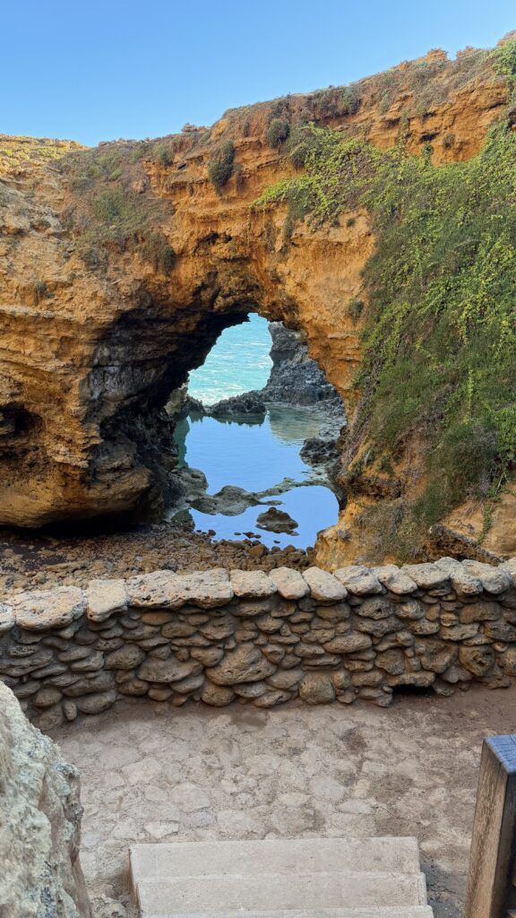 Port Campbell National Park, The Grotto – is a breathtaking natural formation where the ocean meets a sculpted limestone sinkhole and beautifully showcases the raw character of the region’s cliffs. This unique feature creates a window-like opening that frames the crashing waves of the Southern Ocean beyond. At low tide, calm tidal pools form at the base, contrasting with the relentless motion of the sea.