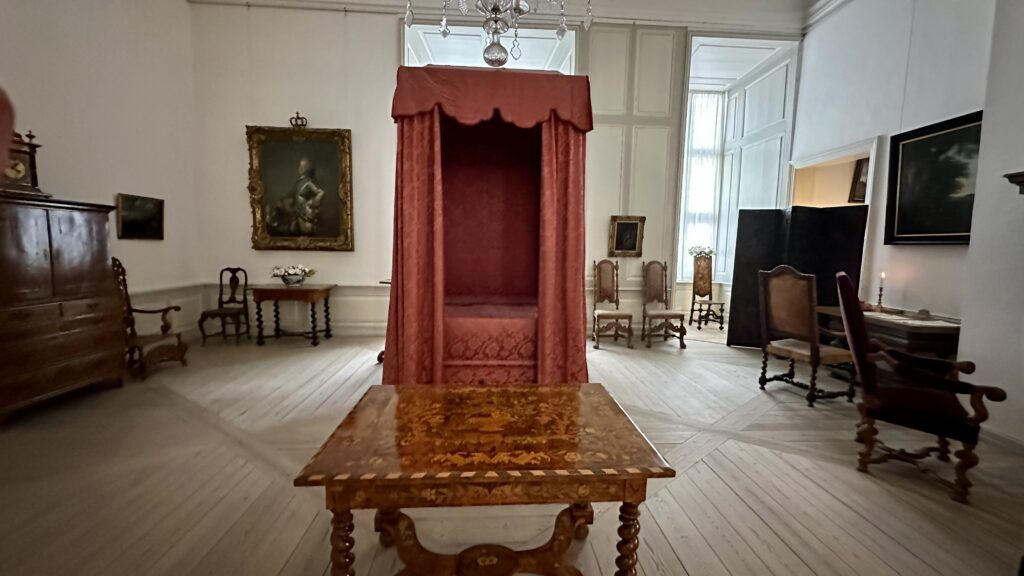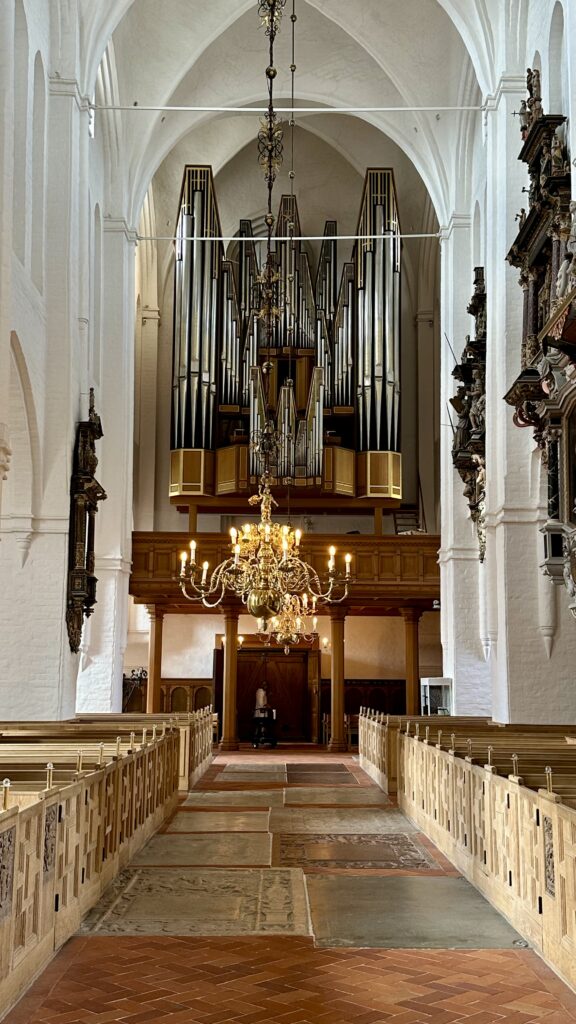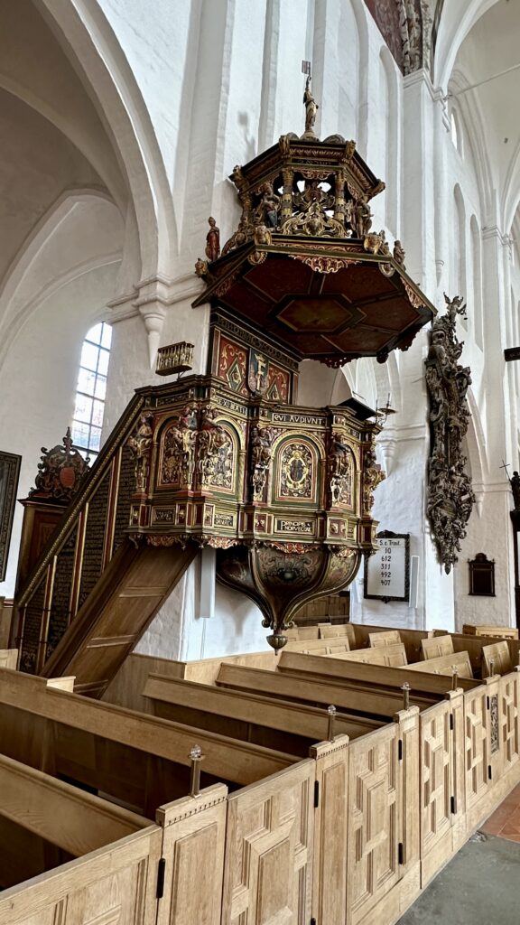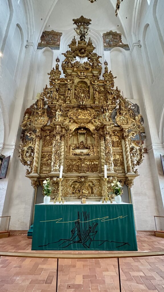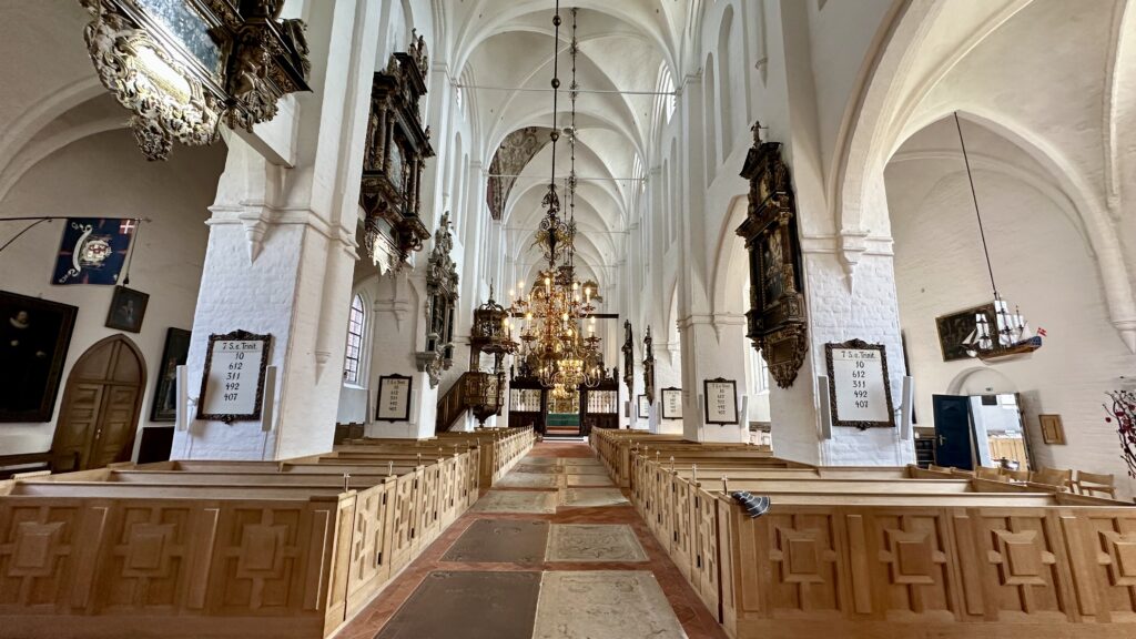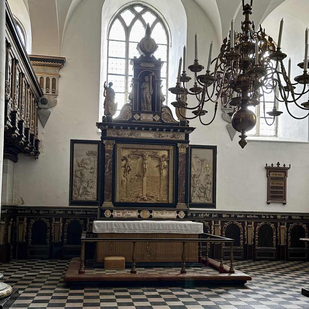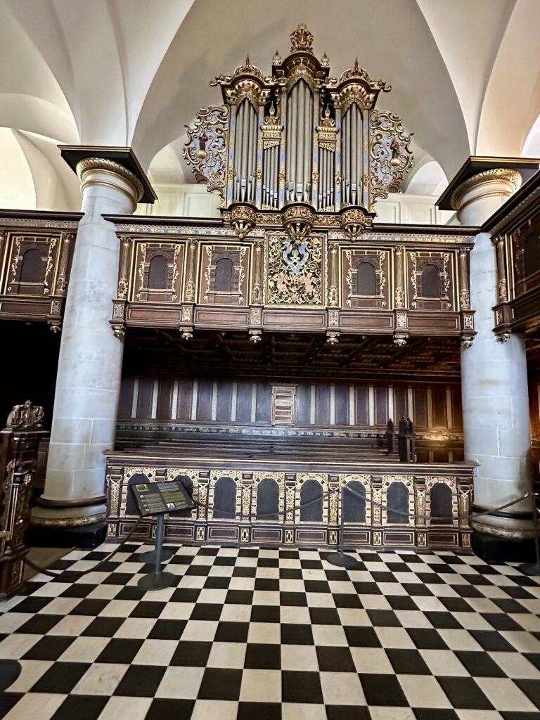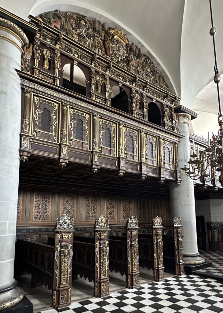 Kronborg Castle, King’s Chapel – Built in 1582, the chapel is an example of Dutch-Flemish Renaissance architecture, with white walls, vaulted ceilings and black and white tiled floor, elaborately carved altar and pews, gilt chandeliers, stunning woodwork, and pipe organ.