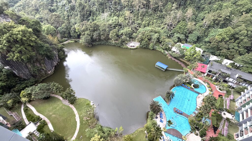 Tui Blue Hotel – By the time we finished seeing all the sites in Ipoh, it was late afternoon. Our guide dropped us off at our beautiful hotel, about a 15-min drive from the city center. The resort was set against dramatic limestone hills, a serene natural lake and surrounded by lush rainforest. At the heart of the property stands Rockhaven, a striking limestone formation rising from the lakeshore, creating a truly unique and scenic setting.