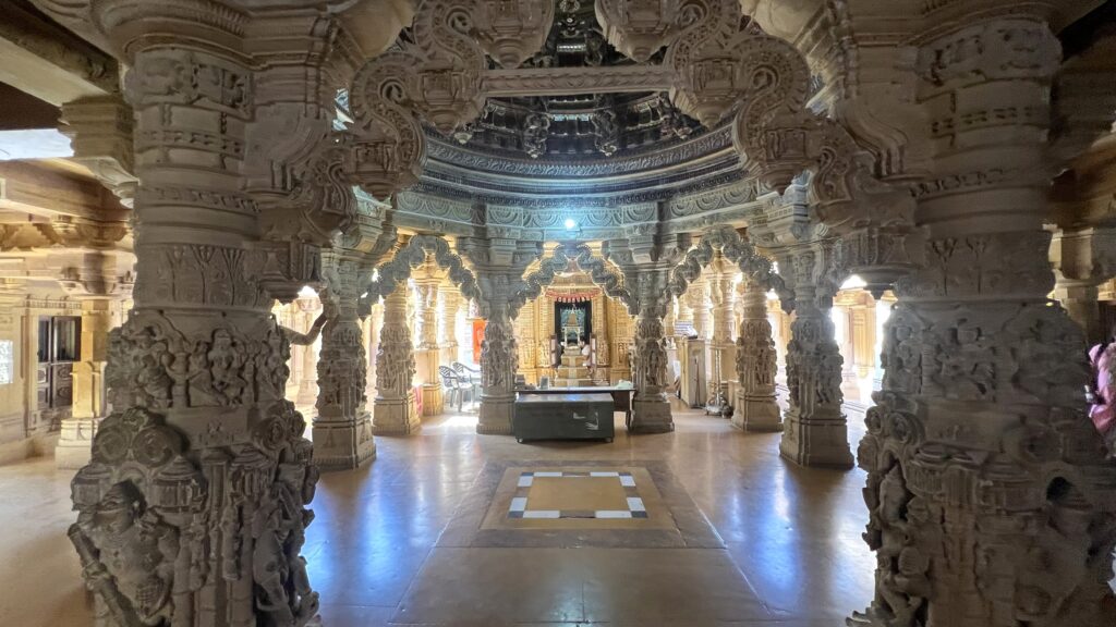 Lodhruva Jain Temple – This temple was constructed in the 9th century under Rawal Jaisal, a famous prince of Bhati clan. It was destroyed in 1152 and was repaired and renovated in 1615. The temple remains the only standing structure in the ruined city of Lodhruva and is renowned for its intricate yellow-sandstone carvings, ornate torana (arched gateway), finely detailed pillars, and stunning jaali work that glows in desert light. The temple features a central dome (over the main sanctum/mandapa) whose ceiling is decorated with intricate stone carvings, often described as a rosette carved from a single piece of stone.