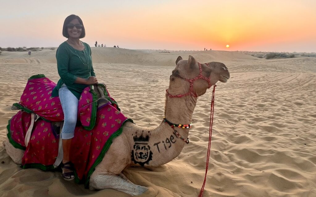 Sam Sand Dunes – Our last activity of the day took us to Sam Sand Dunes, which was a 45-minute drive from Jaisalmer city center. We arrived around 5:10 pm, just in time for our camel ride to the dunes. The ride took about 20 minutes, and we reached the top of the dunes just as the sun began to set, creating a magical, golden desert landscape.
