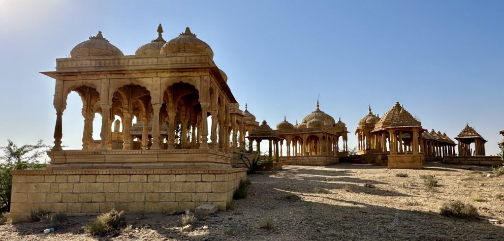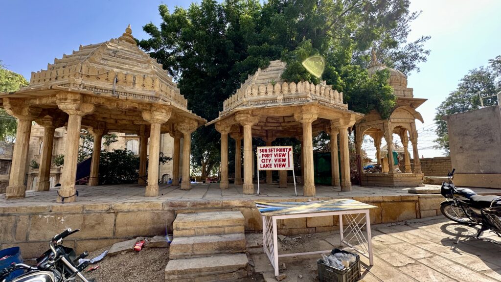 Vyas Chhatri – Located on a sandstone hill overlooking Jaisalmer, Vyas Chhatri is a striking cluster of cenotaphs dedicated to Sage Vyas, the legendary author of the Mahabharata, and to the Vyas lineage who served as royal priests. The site also serves as a cemetery for Brahmins, with many of the monuments dating back 200–300 years. Built from golden-yellow sandstone, the chhatris feature elegant domes, intricately carved pillars, and airy pavilions that glow beautifully at sunset.