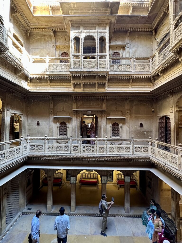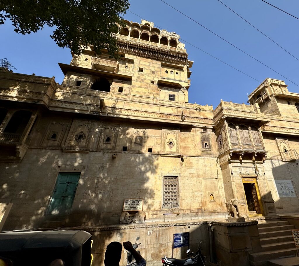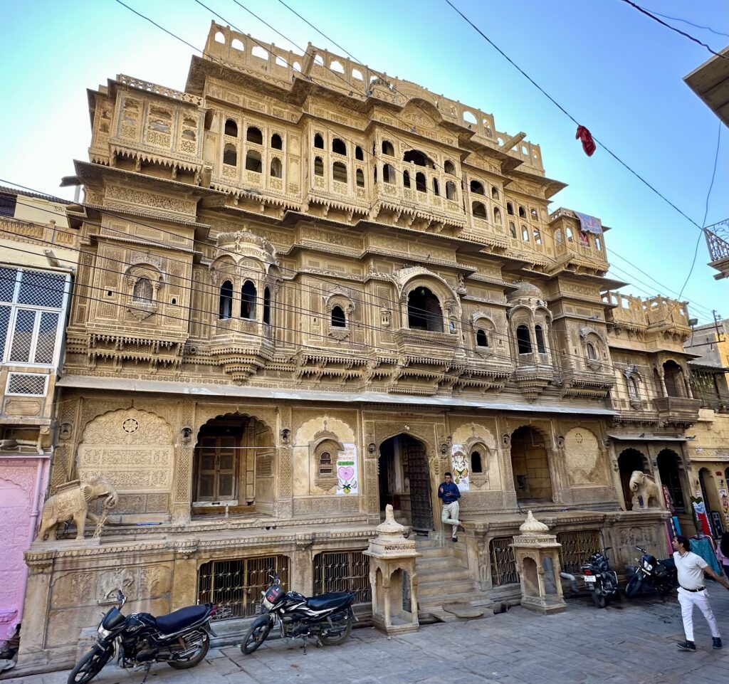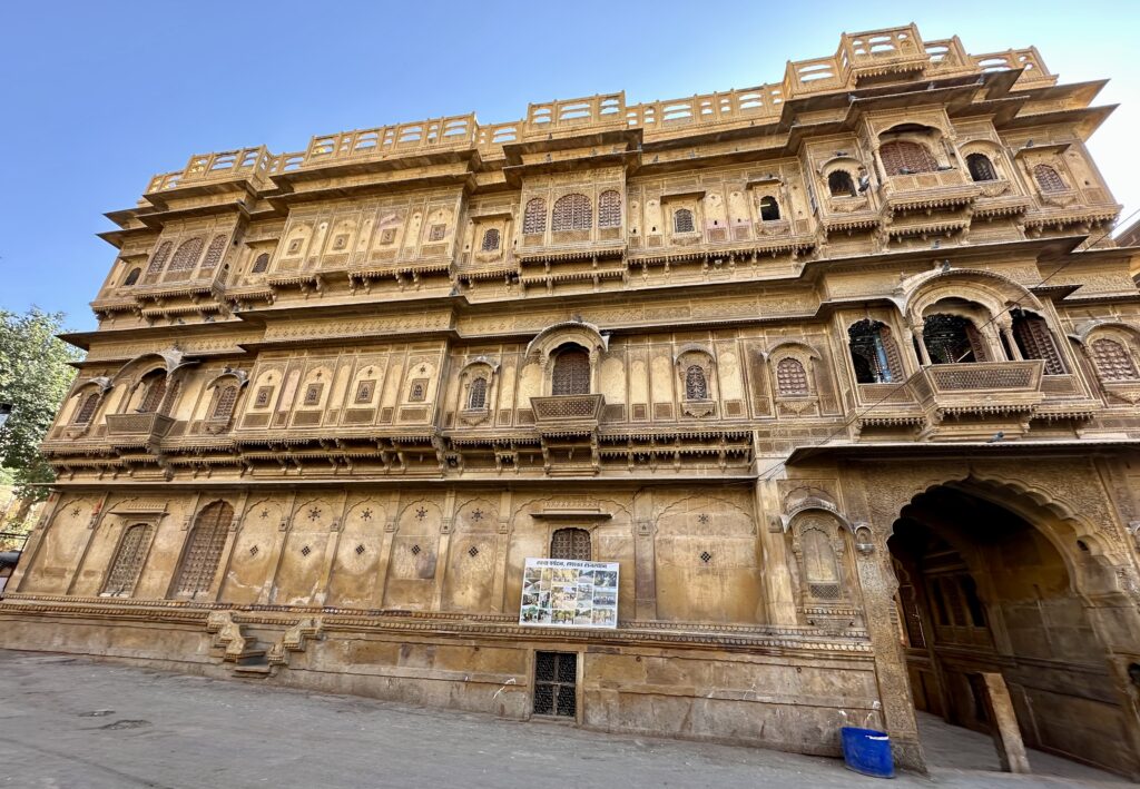Salim Singh ki Haveli – was built in 1815 by Salim Singh, the prime minister of the kingdom when Jaisalmer was the capital. The haveli boasts a fusion of Mughal and Rajput styles, showcasing the region’s rich history and craftsmanship. The striking Peacock Window (Mor Chowk) is one of its standout features, adding to the haveli’s unique charm. We were only able to check out this haveli from outside as it is a private residence.