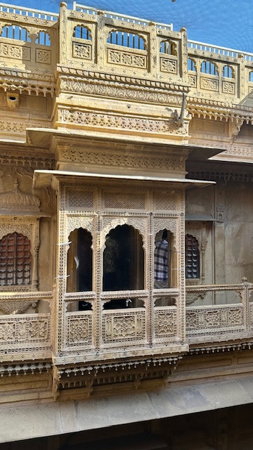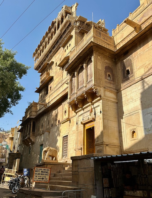 Nathmal Ki Haveli (Mansion) – This was the first of the 3 havelis we stopped to admire. The haveli is named after the then Prime Minister of Jaisalmer – Mohata Nathmal. It was built in 1885 by the Prime Minister’s brothers Lulu and Hathi. It is believed that both the brothers started building the haveli and worked separately on each side of the haveli. They managed to make it appear symmetrical, though a closer look reveals subtle differences. The architecture is a blend of Rajput and Islamic influences, seen in the finely carved balconies, and jharokhas (overhanging windows). The main entrance has two sandstone elephants carved from yellow sandstone, positioned as if guarding the haveli.