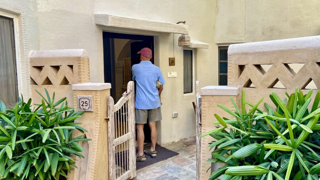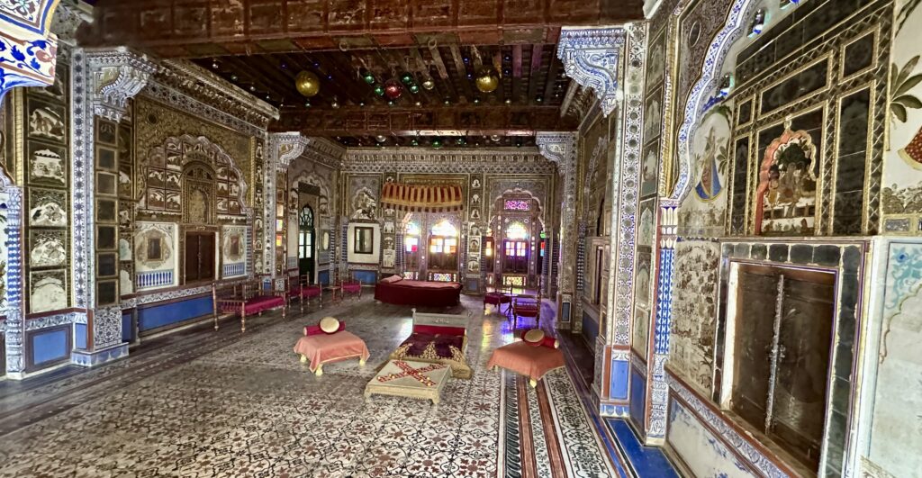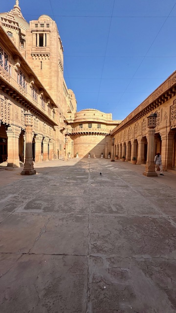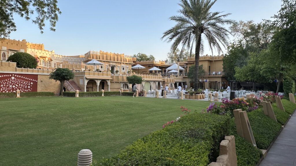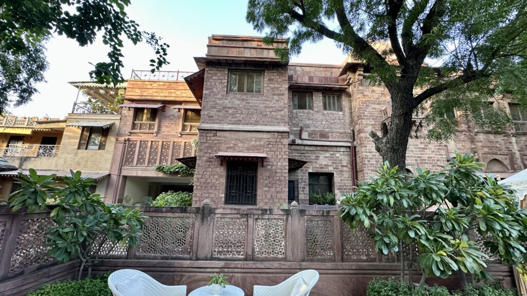 Jodhpur is less than a five-hour drive from Jaisalmer. We arrived by 5 p.m. and checked into our hotel, Ajit Bhawan—India’s first heritage hotel. Set within a grand palace complex, it seamlessly blends timeless Rajput architecture with modern comforts. To reach our room, we had to open a small, charming gate, which added a lovely touch to the experience. The room itself was spacious and comfortable, with a separate living area and a cozy bedroom.