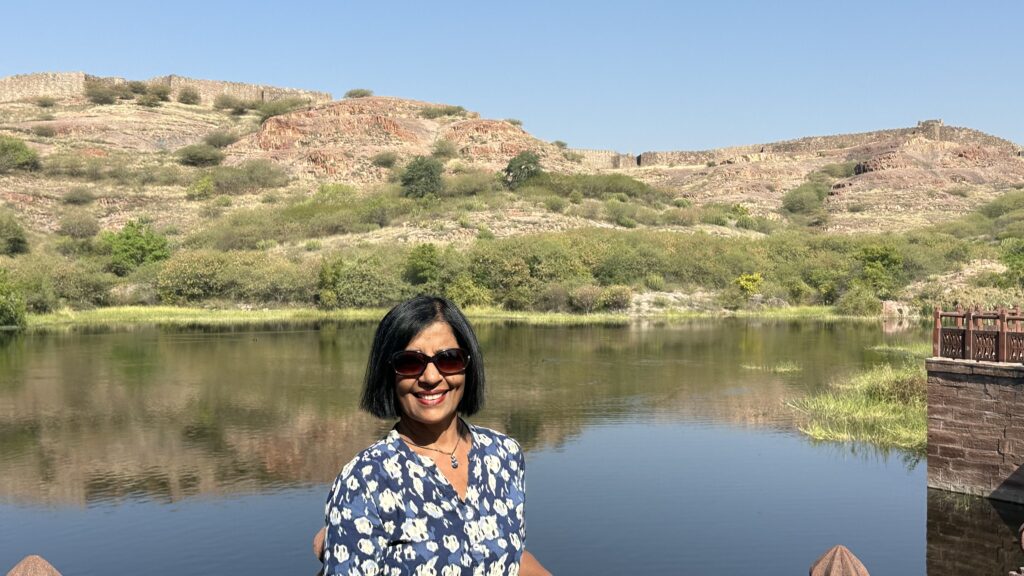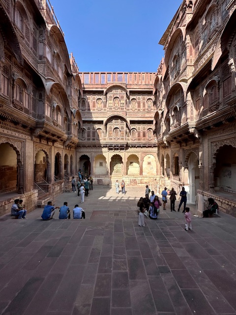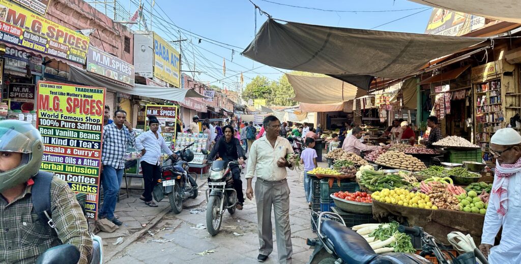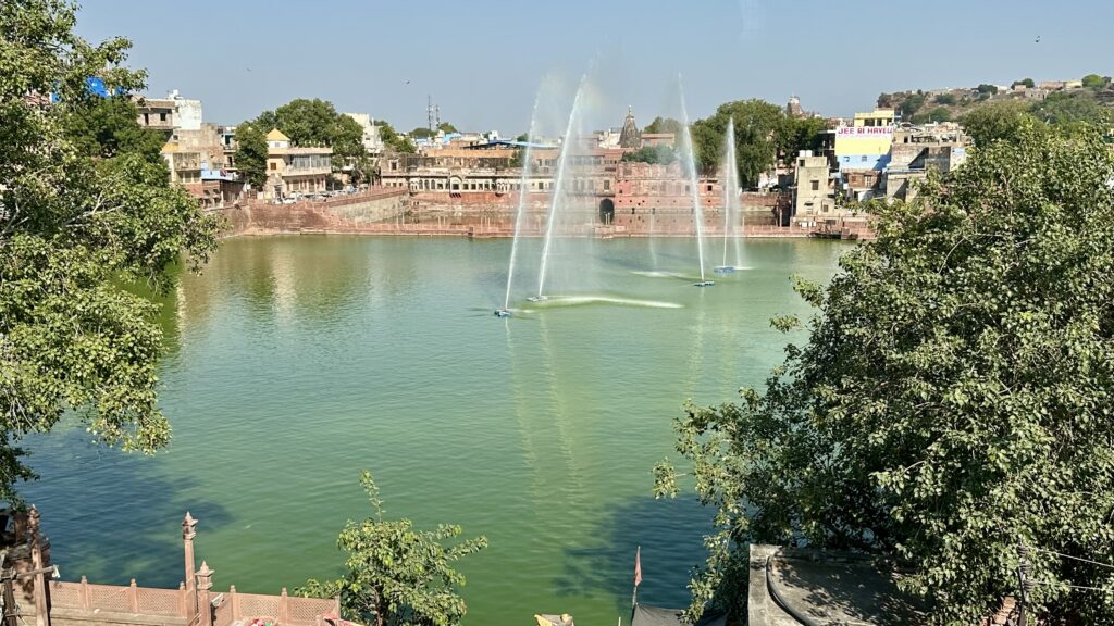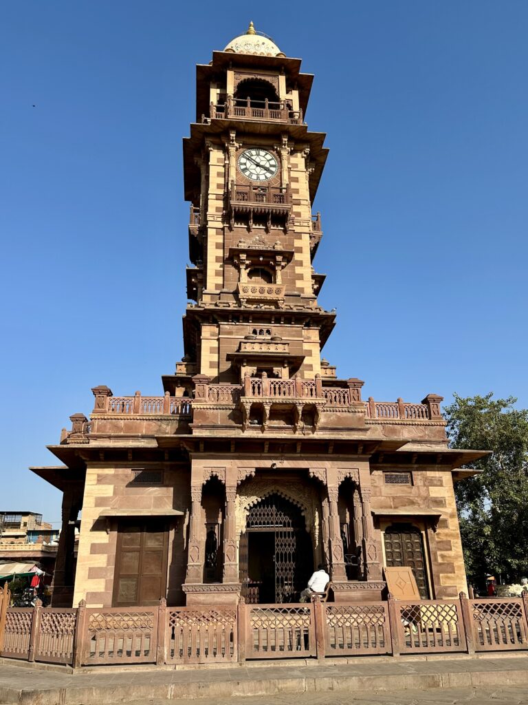 Jodhpur City Center – After leaving the fort, we first stopped for lunch at a restaurant overlooking the central fountain on Gulab Sagar, a lovely and relaxing spot. We then walked down to the bustling city center, home to the Ghanta Ghar (Clock Tower) and its vibrant marketplace. We spent some time wandering through the lively streets and even visited a textile shop, where we were shown a stunning collection of handmade blankets that are crafted locally and sold all over the world.