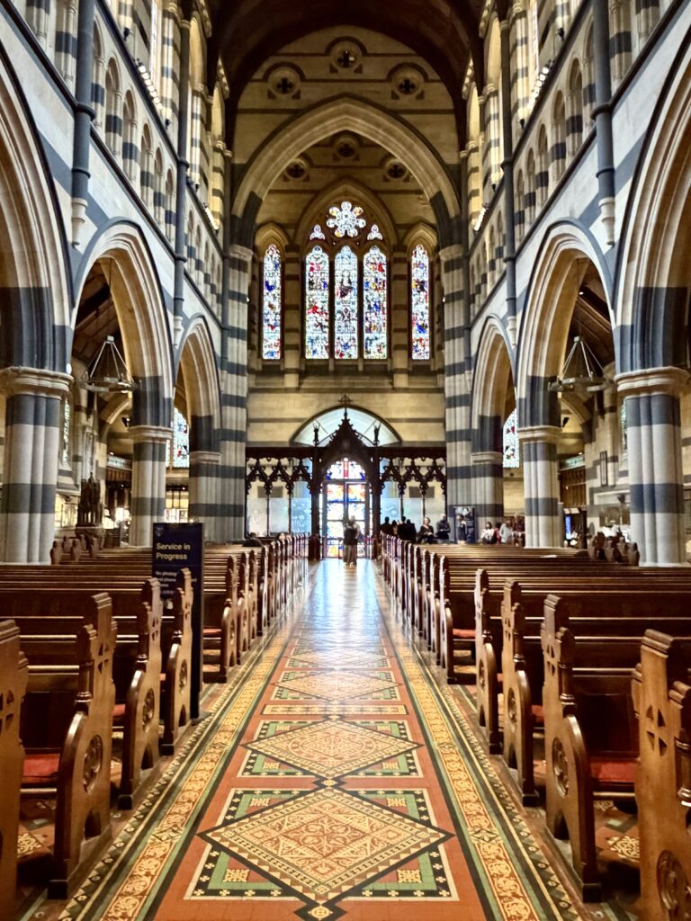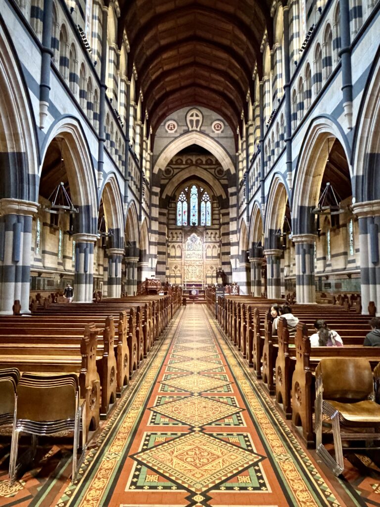 The interior of St Paul’s Cathedral is richly decorated with bold colors and strong contrasts, typical of William Butterfield’s style. Built using Waurn Ponds limestone and dark bluestone, it showcases High Victorian Gothic polychromy, especially in the floor, dado, high altar, and reredos (the ornamental screen covering the wall at the back of an altar). The cathedral floor is paved with decorative encaustic tiles from the English firm Maw & Co., while the walls include patterned glazed tiles.