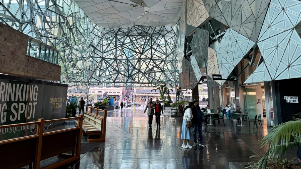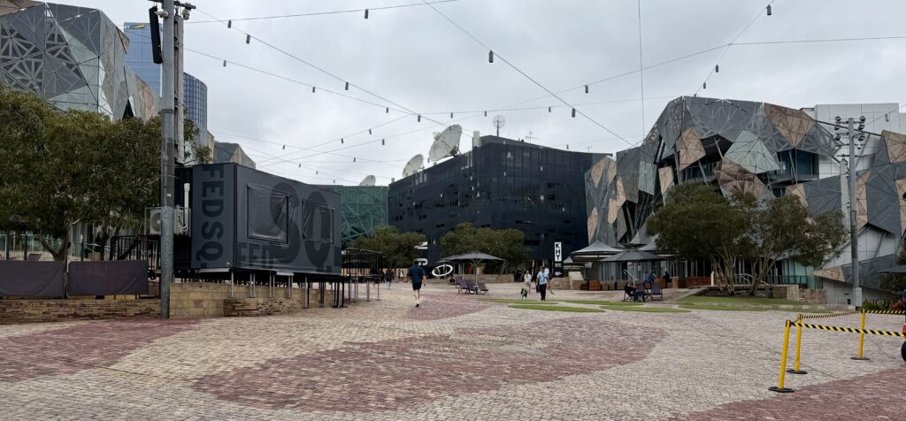 Federation Square, Australian Center for moving Image (ACMI) – Established in 2002, this free attraction is Australia’s national museum of screen culture, covering film, television, video games, digital culture, and art. It features curated exhibitions, a permanent exhibition called The Story of the Moving Image, as well as film screenings, events, a library, online collections, and educational programs. However, we were unable to explore it as it had closed by the time we arrived after spending over an hour at the NGV.