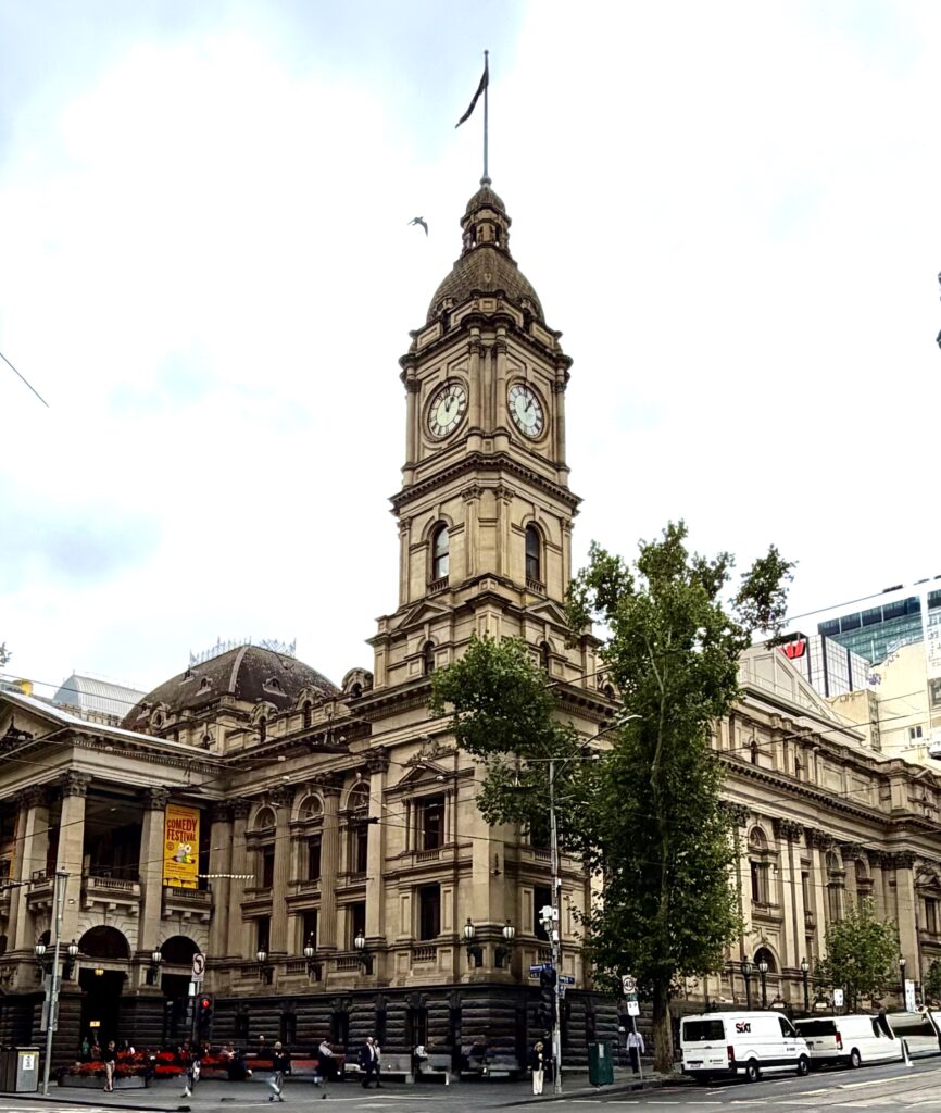 Melbourne Town Hall – features a grand Victorian-era façade in a classical style. Its exterior includes a prominent clock tower, arched windows, and ornate columns. Today, the Melbourne Town Hall is used as a major civic and cultural venue in Melbourne. It hosts official functions, council meetings, and public events, as well as concerts, exhibitions, and festivals.