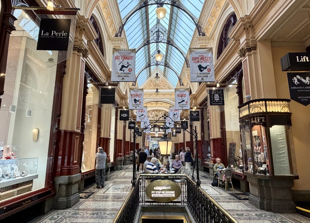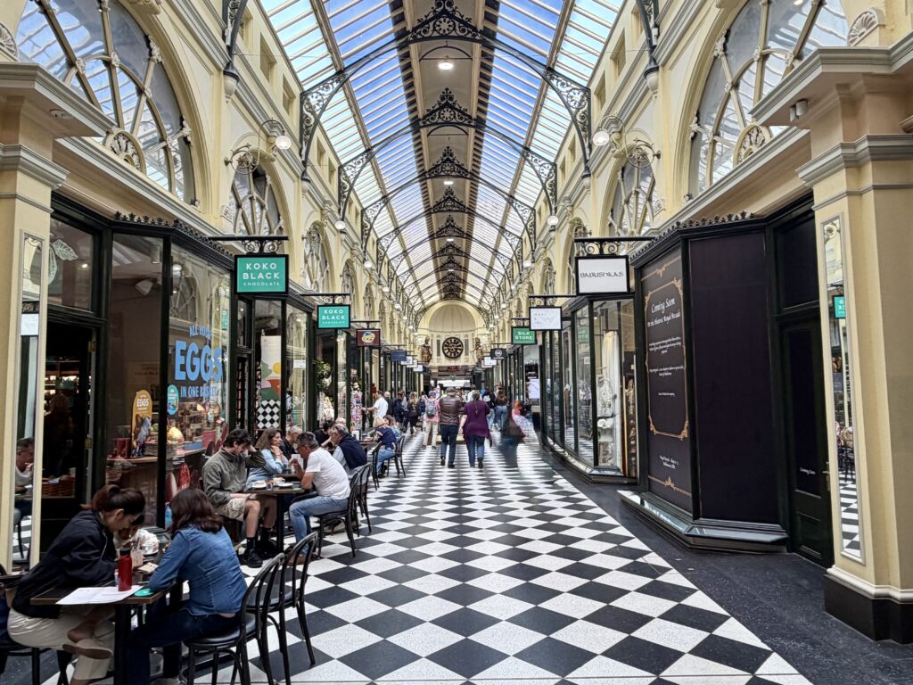 Block Arcade – is a historic shopping arcade in Melbourne’s central business district, constructed between 1891 and 1893. Designed by architects Twentyman & Askew, it is celebrated as one of the finest examples of late Victorian architecture and a popular tourist attraction. The arcade features an L-shaped layout with an octagonal rotunda, mosaic-tiled floors, a glass canopy supported by cast and wrought iron, and elaborate timber shopfronts.