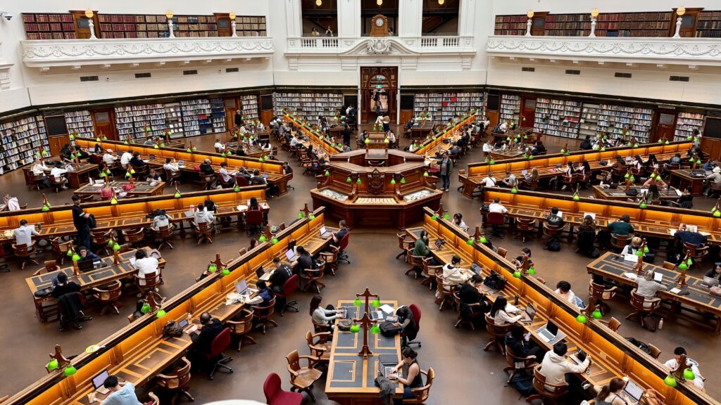 The interior of the library is stunning and grand, reflecting its 19th-century heritage. The centerpiece is the La Trobe Reading Room, a magnificent domed circular space with soaring ceilings, elegant columns, and soft natural light streaming through the skylight. The room’s classical design, with rows of polished wooden desks and intricate detailing, creates an inspiring atmosphere for study and reflection.