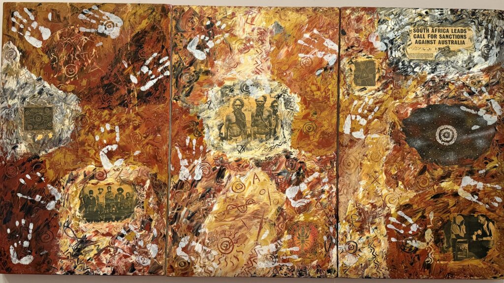 The Story Unfolds by Richard Bell – This painting consists of 3 panels joined by hinges each featuring layered painted and archival imagery that examines political themes including First Nations human rights and land rights in Australia. The work incorporates newspaper headlines from the past, circulating them in the present, as well as archival images of Aboriginal people in chains receiving rations while dressed in colonial English attire. The painting critiques colonialism, racism, and commercialization of Aboriginal art and culture.