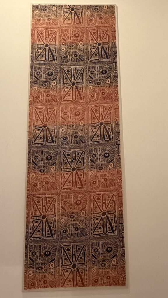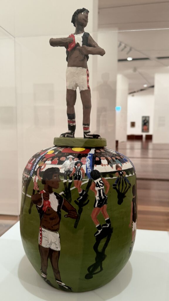 - I’m Black (Nicky Winmar) by Rona Panangka Rubuntja – This work celebrates legendary AFL star, Nicky Winmar, who in 1993 defiantly protested racial taunts by pointing to his skin color. His action held widespread attention across Australian media and called to action the ongoing issues of racism in Australian sports.