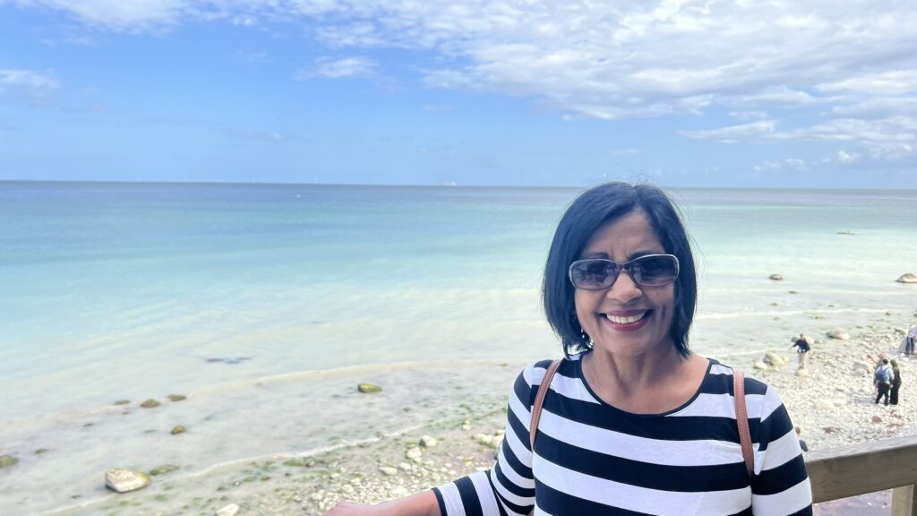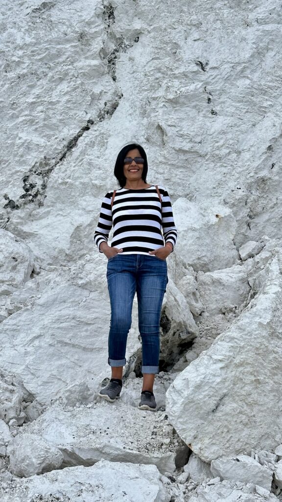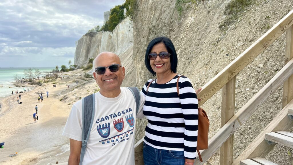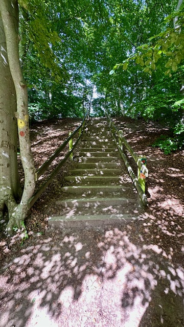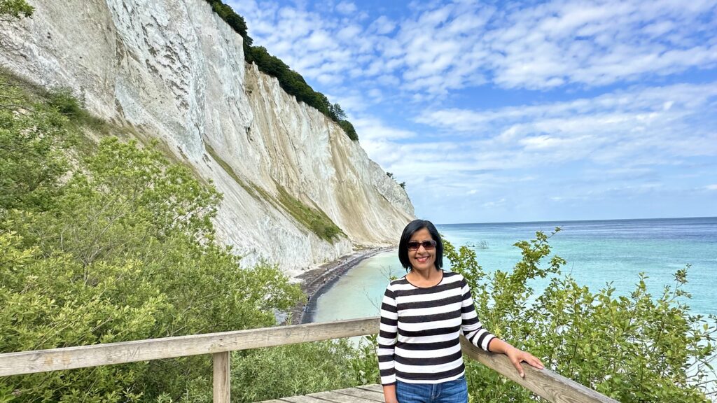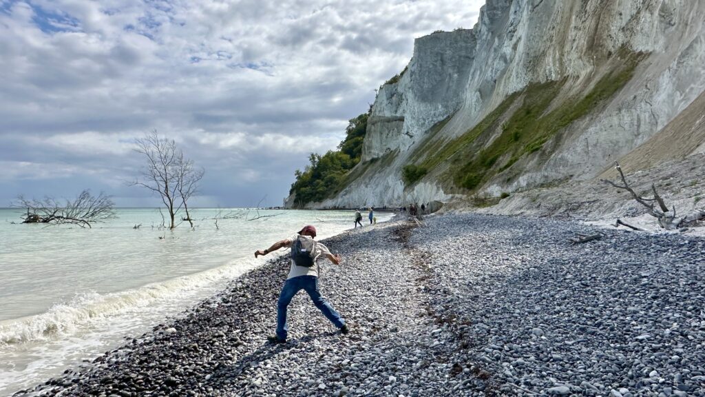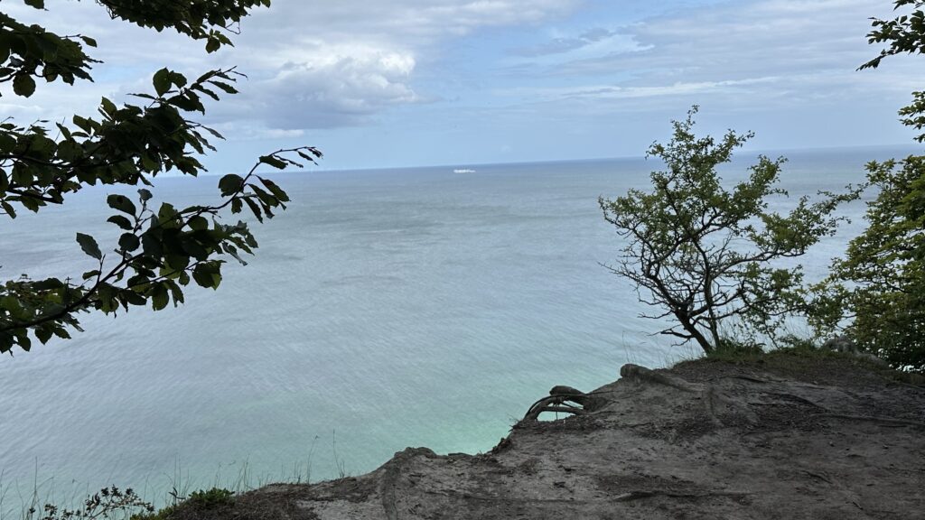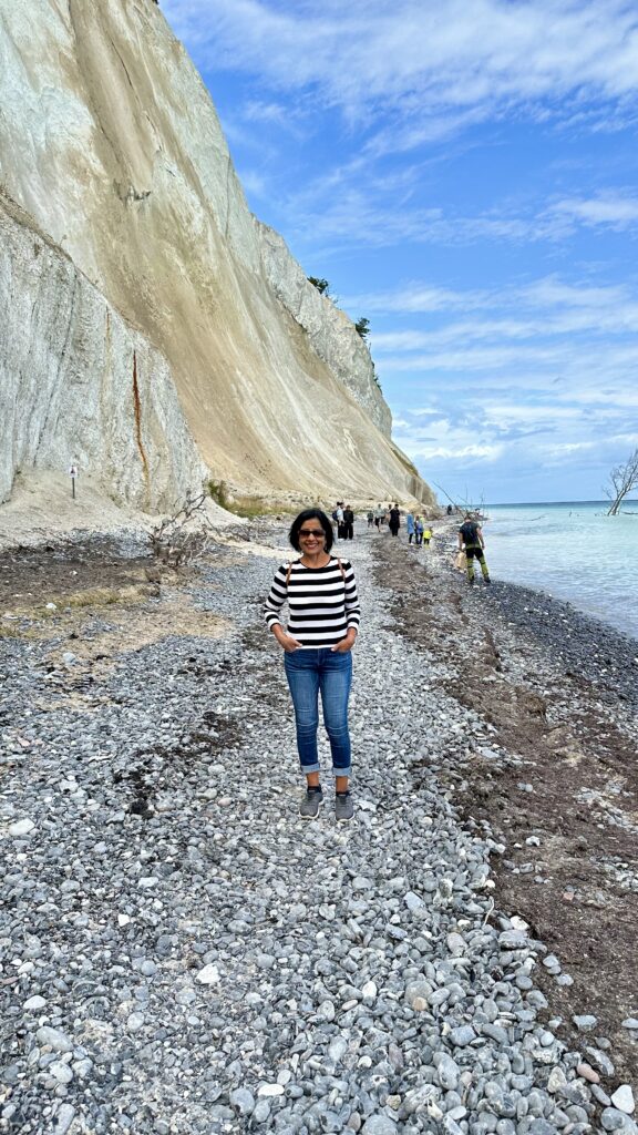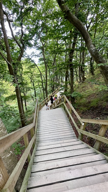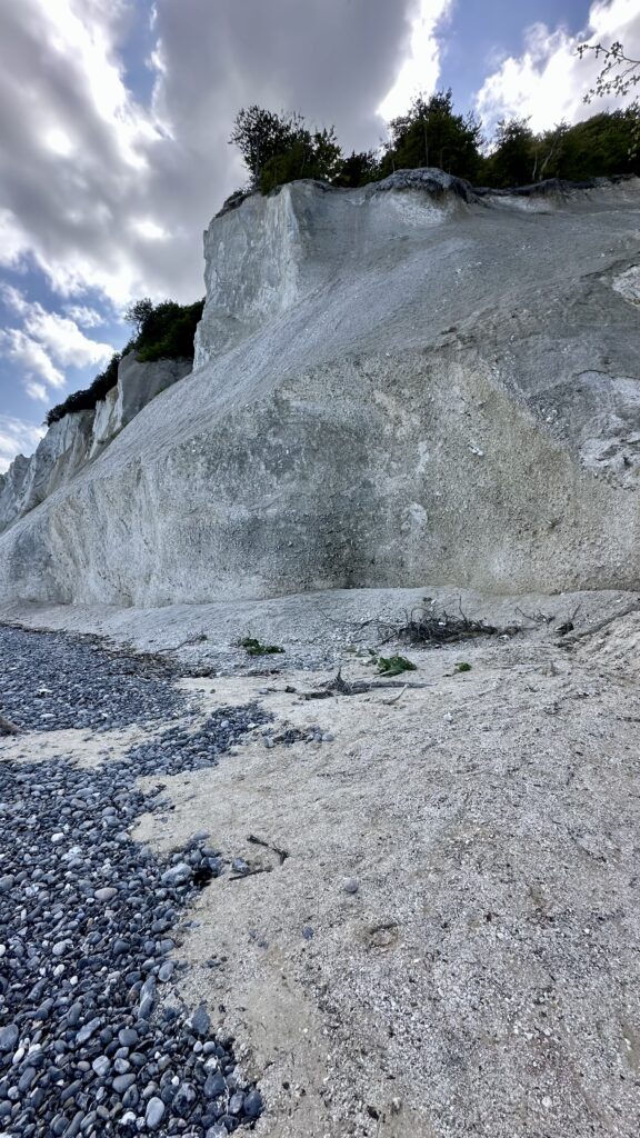 We decided to walk down to the beach first which required us to climb down about 500 steps. The view of the sea and the chalk white cliffs as we reached the base was breath taking. The cliffs are primarily composed of Cretaceous chalk, formed from the remains of microscopic marine organisms that lived over 70 million years ago. The cliffs are constantly eroding due to wave action from the Baltic Sea, exposing layers of chalk and flint.