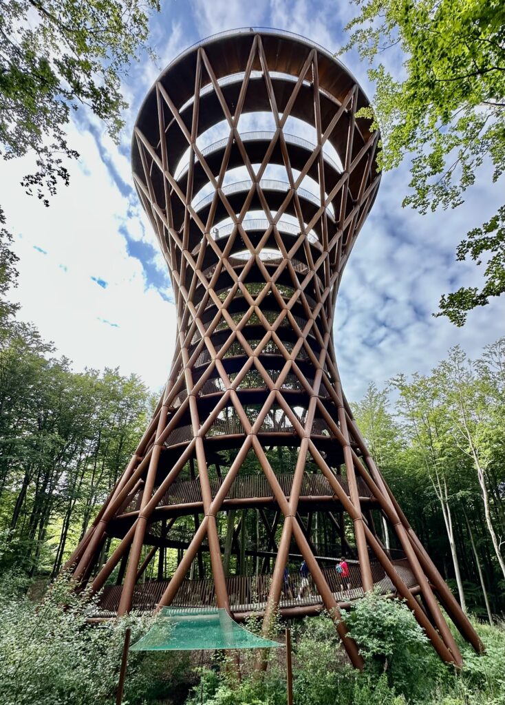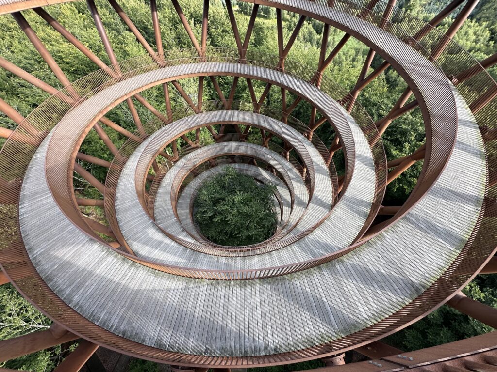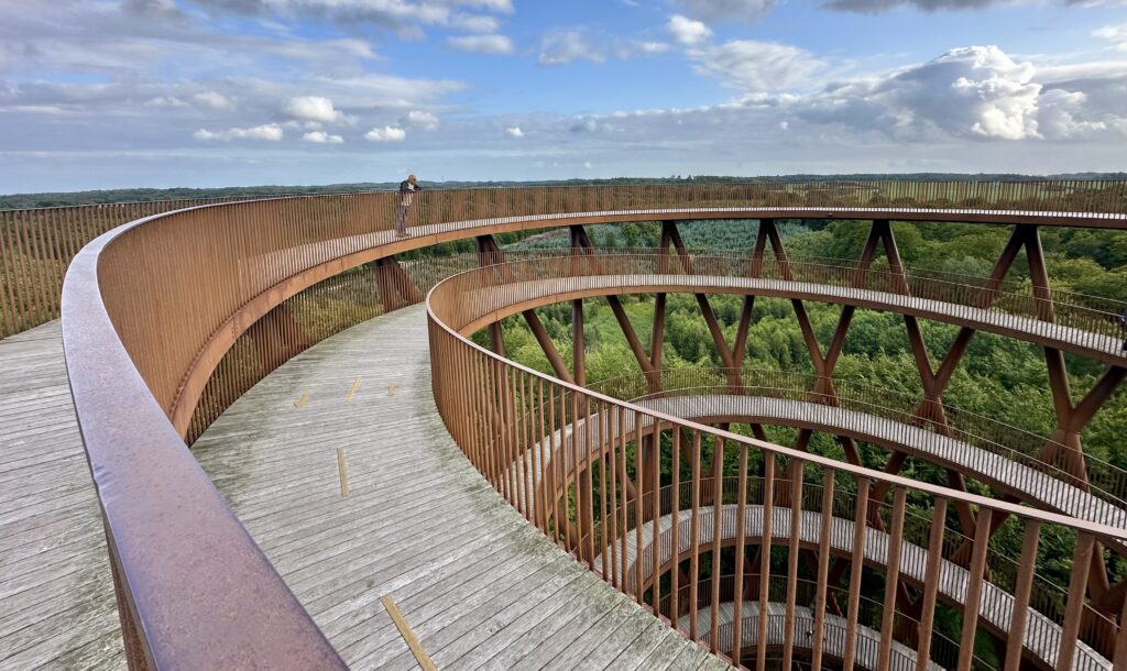 After about 1km the path brings you to the base of the tower. To blend in with the surrounding landscape, the award-winning tower has been made of naturally rusty steel and locally-grown oak. It loops around 12 times, with slight changes to the incline and width of the tower as you climb. A wide view of the surrounding forest greets you at the top.