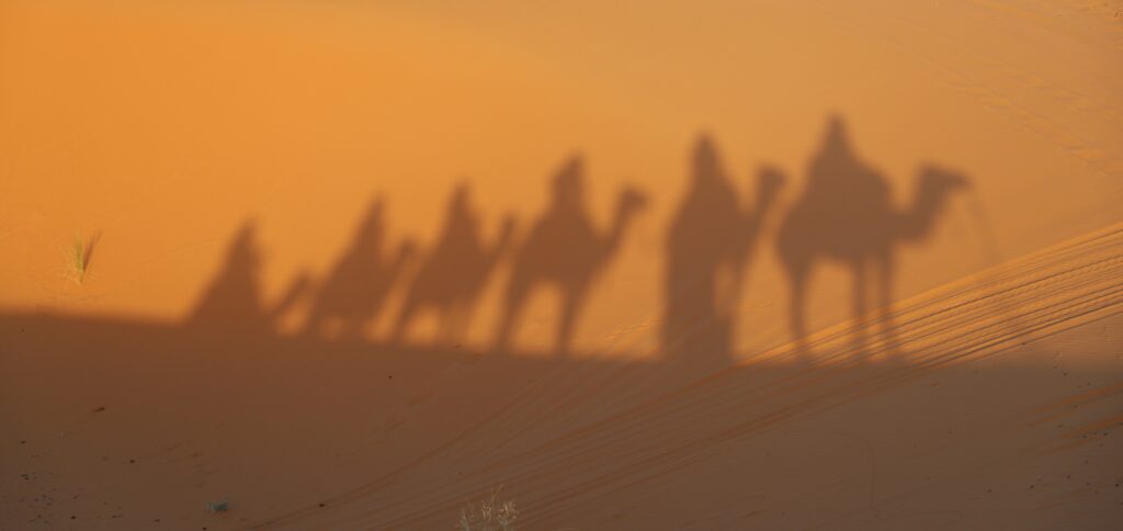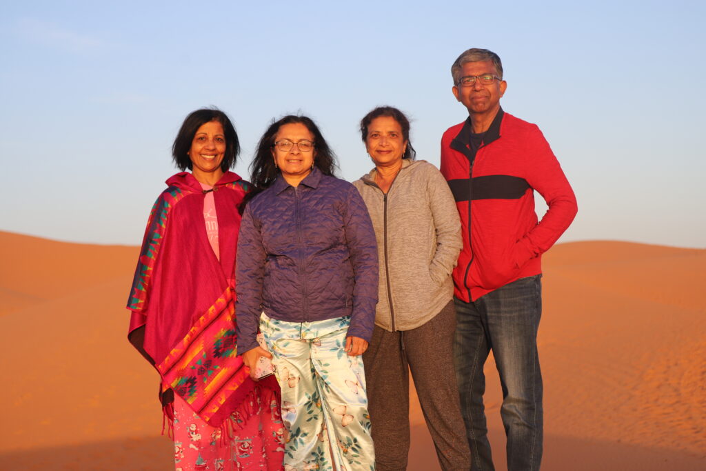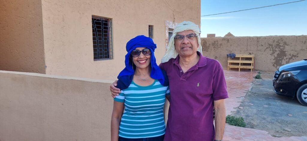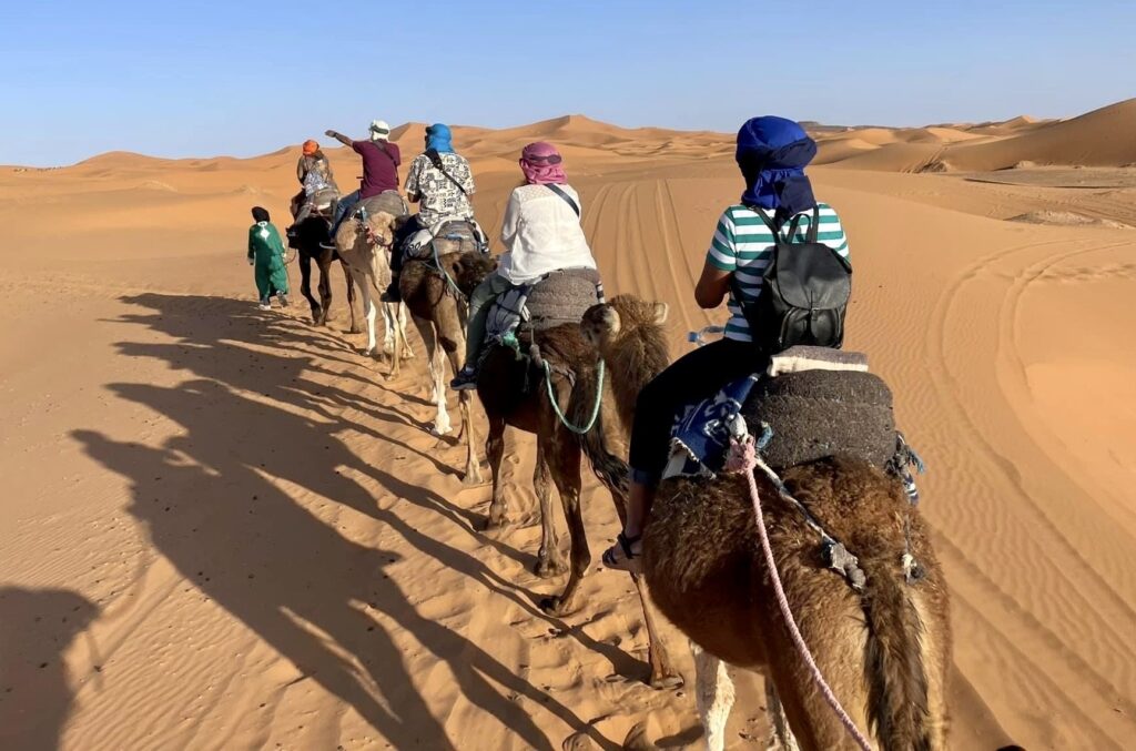 Sahara – Late in the afternoon when it got cooler, we mounted on camels and rode into the desert, enjoyed sunset over the golden dunes and slept overnight at one of the many luxury camps. There was music entertainment late into the night. We enjoyed early morning sunrise before returning to Merzouga. We then started preparing for the camel ride.