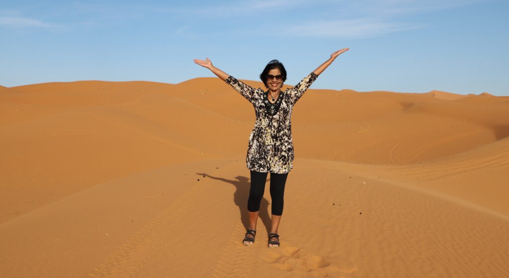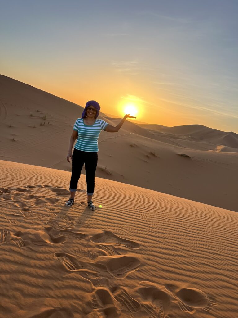 Exploring Merzouga and Sahara – We spent some time in the morning visiting a beautiful garden and then visited the Gnawa people (originally from Sudan) who entertained us with their wonderful music. For lunch we had the delicious Berber Pizza at Cafe Nora, a dish made in the Berber style, which is a stuffed pizza of sorts without the usual tomato sauce and cheese. In addition to the pizza being very delicious, the restaurant had a great setting for a relaxed lunch and followed by local coffee made with dates!