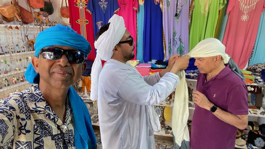 We had to first prepare for the camel ride – We wore a scarf (like turban) around our head, which could also be used to cover our face from dust and sandstorms. Sunglasses to cover your eyes from dust.