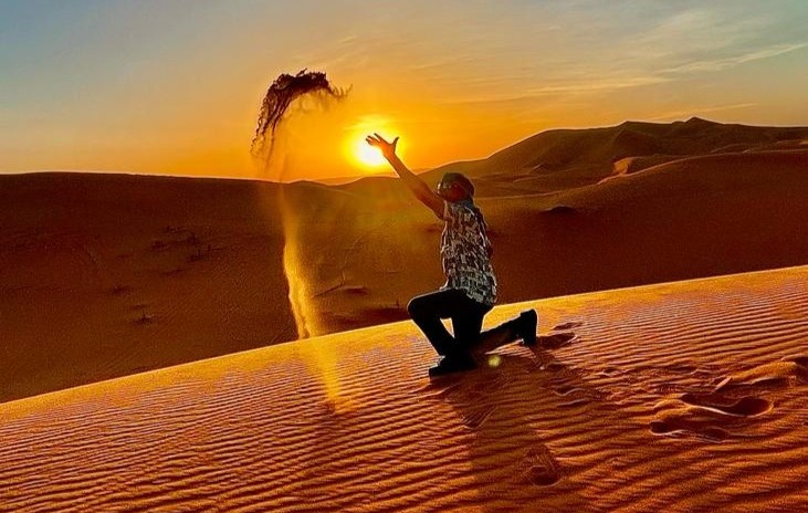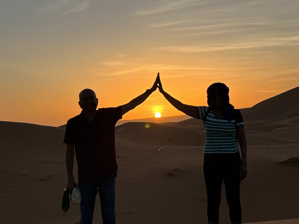 We then started our camel ride through the dunes of Erg Chebbi to reach a luxury desert camp in Sahara for an overnight stay. We stopped to enjoy sunset on the way. Took some great pictures playing with the sand and sun.