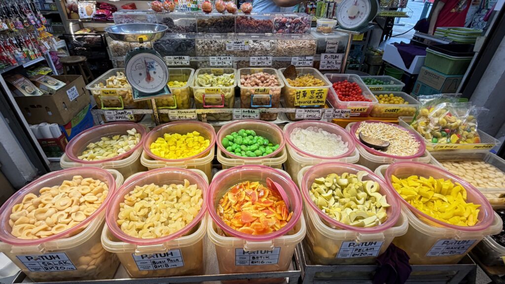 Chowrasta Market in George Town – Located along Penang Road, Chowrasta Market is one of the oldest traditional markets in George Town dating back to the late 19th century and remains a lively hub for locals. The ground floor is a wet market selling fresh vegetables, fruits, seafood, and meat, while the upper level features stalls offering local products such as nutmeg, pickled fruits, spices, and Penang souvenirs.