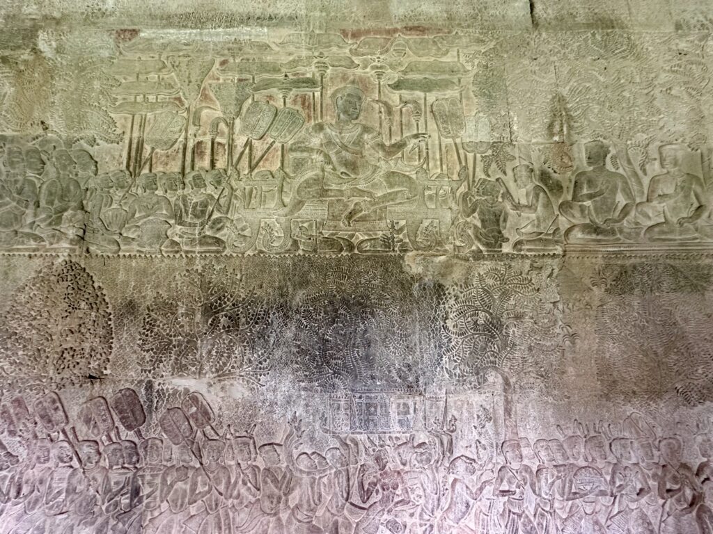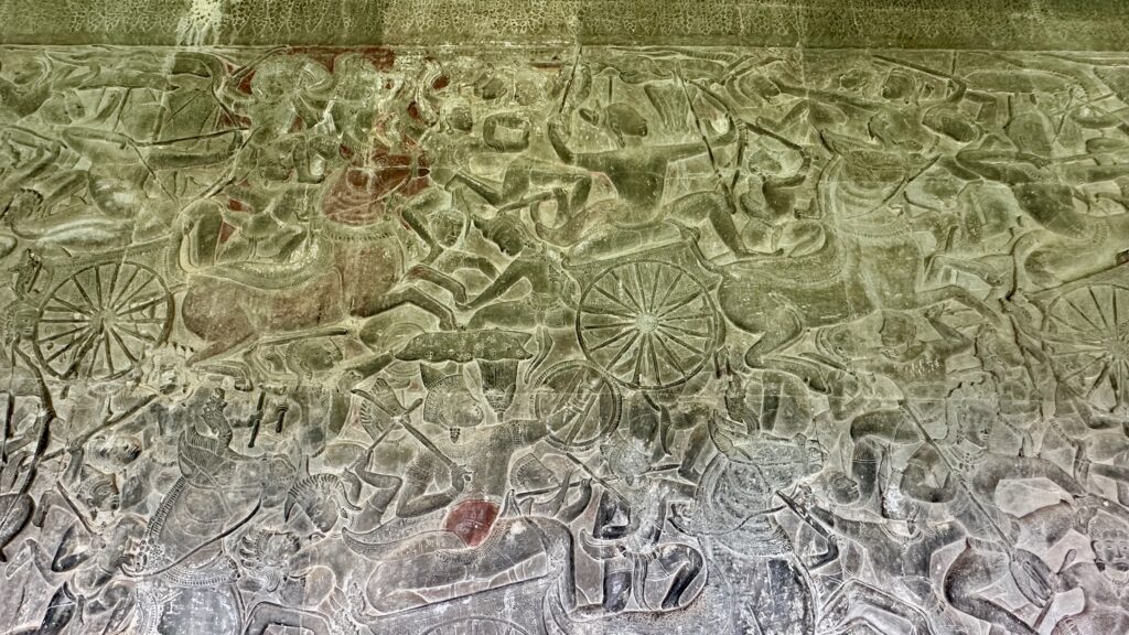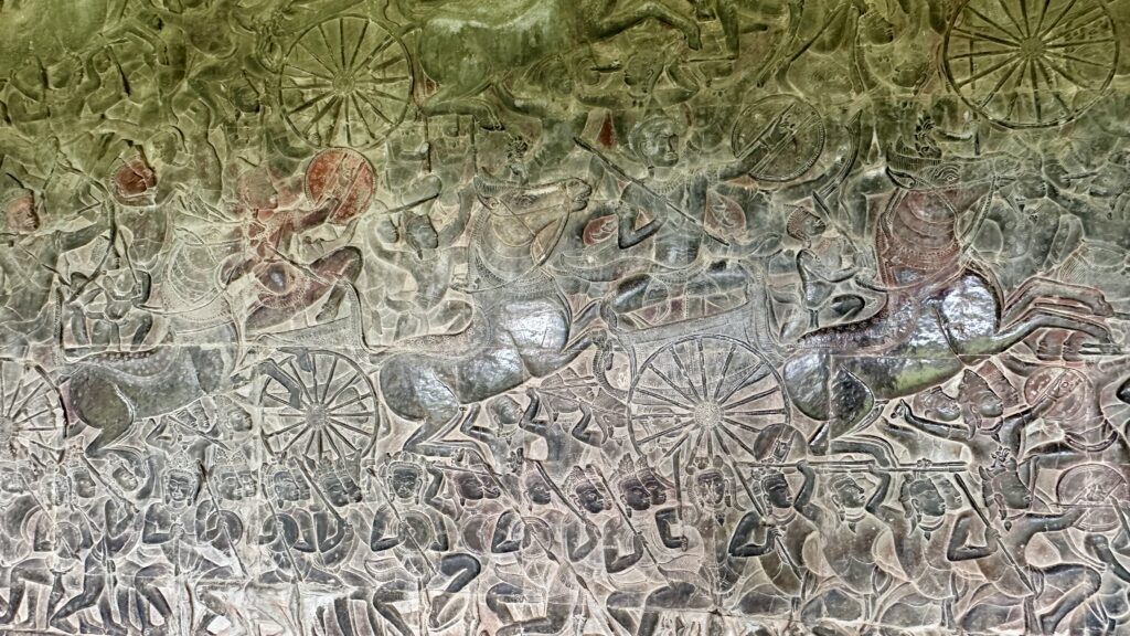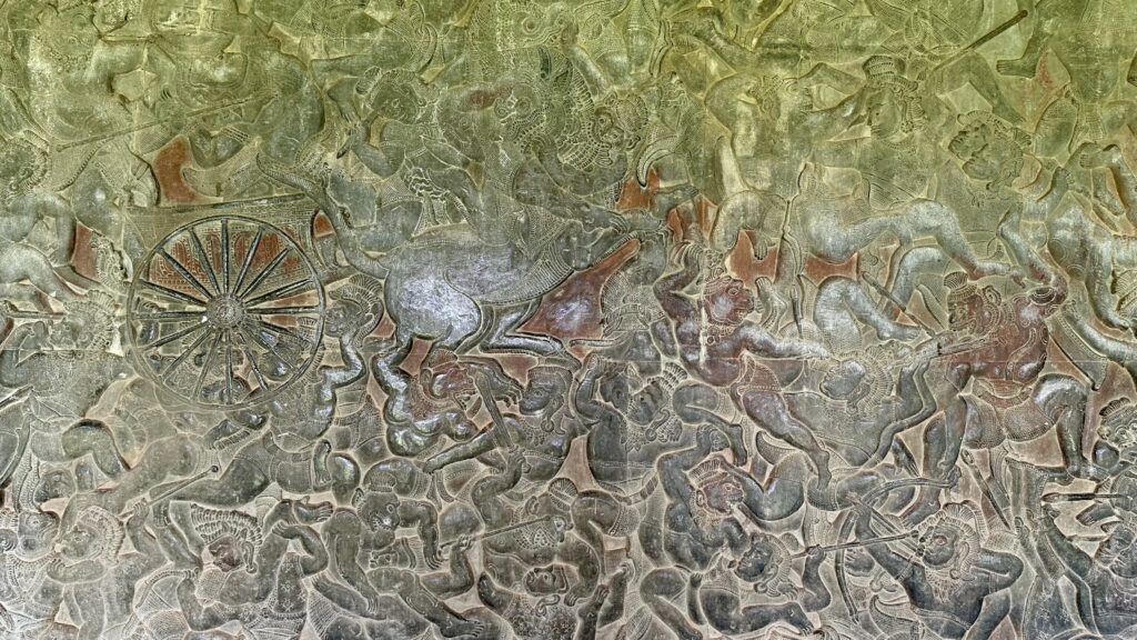 Angkor Wat, Scenes from Mahabharat – The battle of Kurukshetra between Kauravas and Pandavas is depicted with many carvings of the army, Arjuna, Krishna, Bhishma, and Drona. This is one of the longest bas-reliefs in the world, stretching over 160 feet, depicting the entire battle scenes.