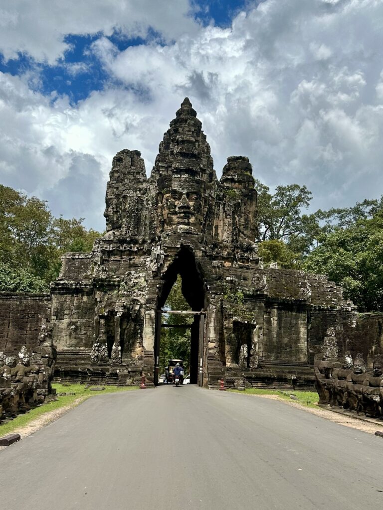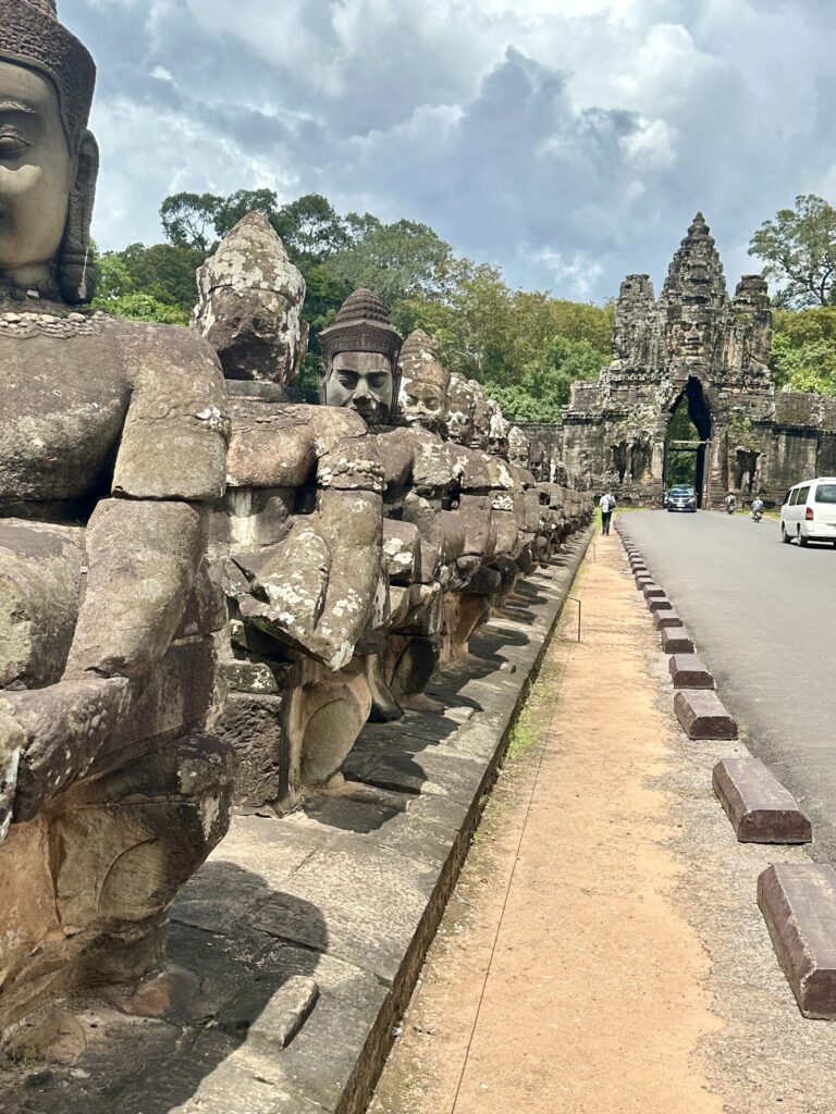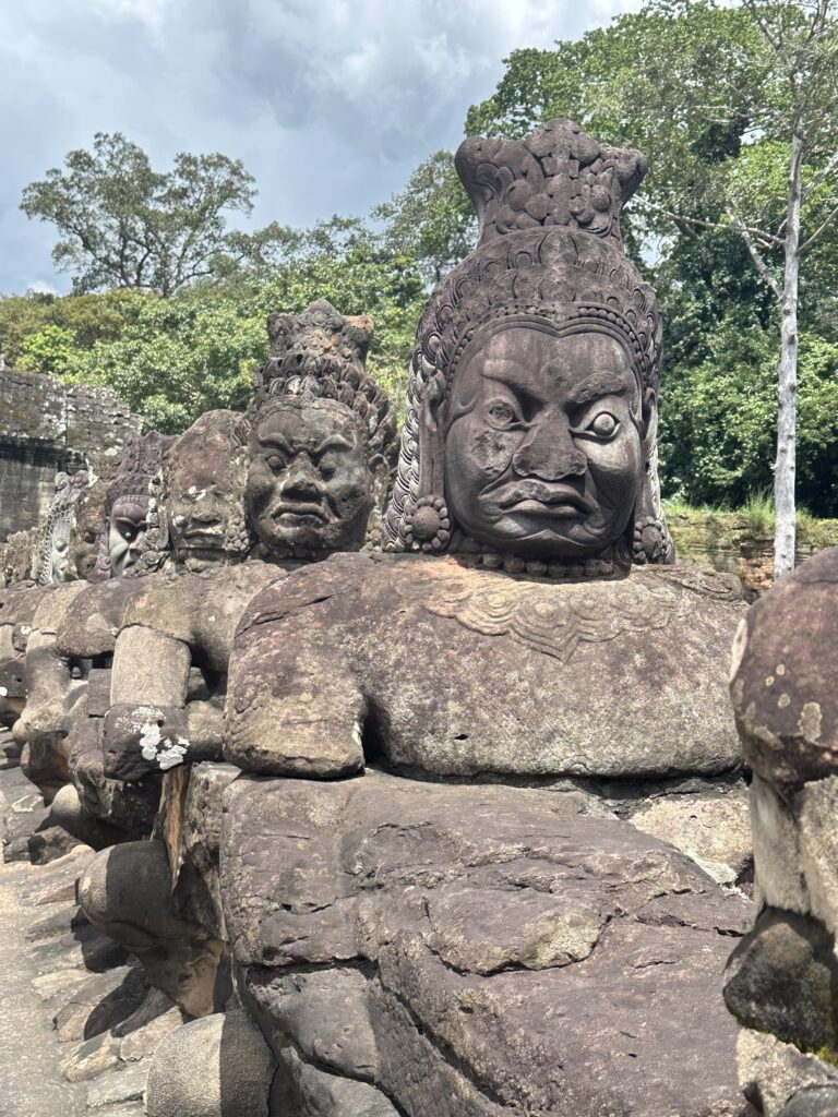 Angkor Thom has 5 entrances, including the four cardinal gates (North, South, East, and West) and the Victory Gate on the east side. Each of the five gates features a tower topped with four enormous faces and leads to the center of the city, with the South Gate being the most famous. Leading up to the entrances at the South and Victory Gates, are 54 statues of Asuras (demons) on one side and 54 Devas (gods) on the other, with each figure holding on to the body of a giant naga (serpent). The Naga’s body forms a long railing over the causeway. This is a symbolic representation of the “Churning of the Sea of Milk” myth. We entered the temple from South Gate.