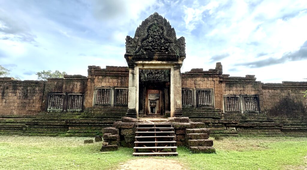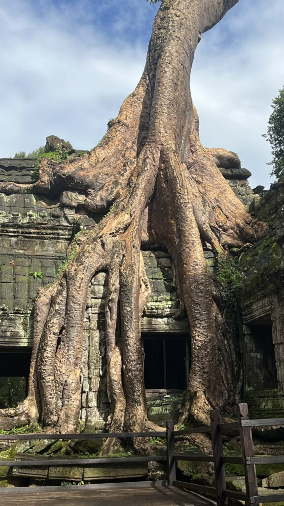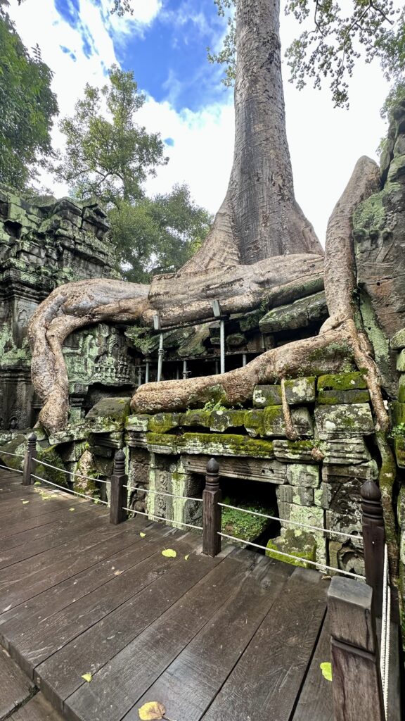 Ta Prohm Temple (aka Tomb Raider Tomb) – This 12th century temple built by King Jayavarman VII, is famous for its dramatic appearance in the 2001 film Lara Croft: Tomb Raider. You’ll encounter massive tree roots snaking around, over, and through crumbling stone walls, creating a dramatic fusion of nature and architecture. It is one of Cambodia’s most photographed and Instagram-worthy locations. The most popular of the root formations over stone wall is the one at the entrance pavilion, and is nicknamed Crocodile Tree (or Tomb Raider tree)
