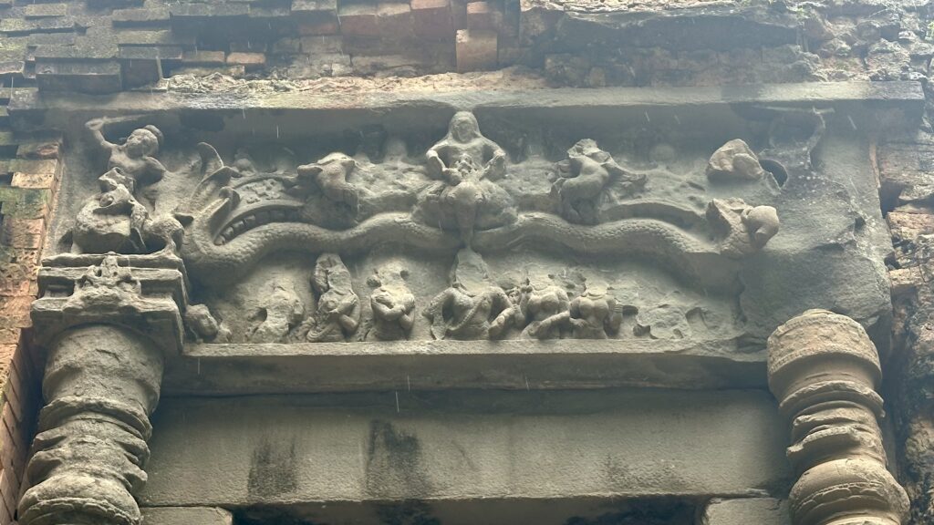 - The lower level or the outer gallery features the intricately carved scenes from Hindu epic Ramayana and Mahabharata